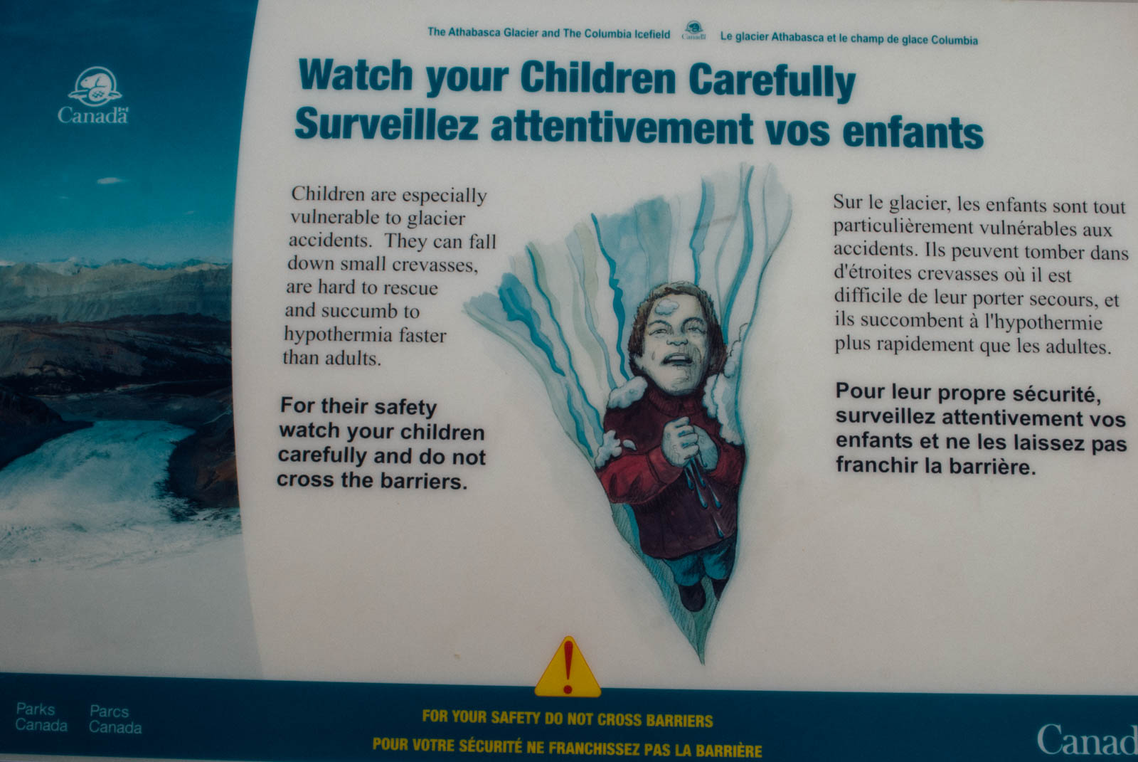 Encore fascinés par l'histoire du gamin dans sa crevasse[3] qui a sans doute inspiré le panneau d'avertissement de tout à l'heure, la journée s'est conclue en allant regarder des vidéos Youtube de l'Everest où, je l'ai appris à cette occasion, les corps sont laissés tels quels (!).