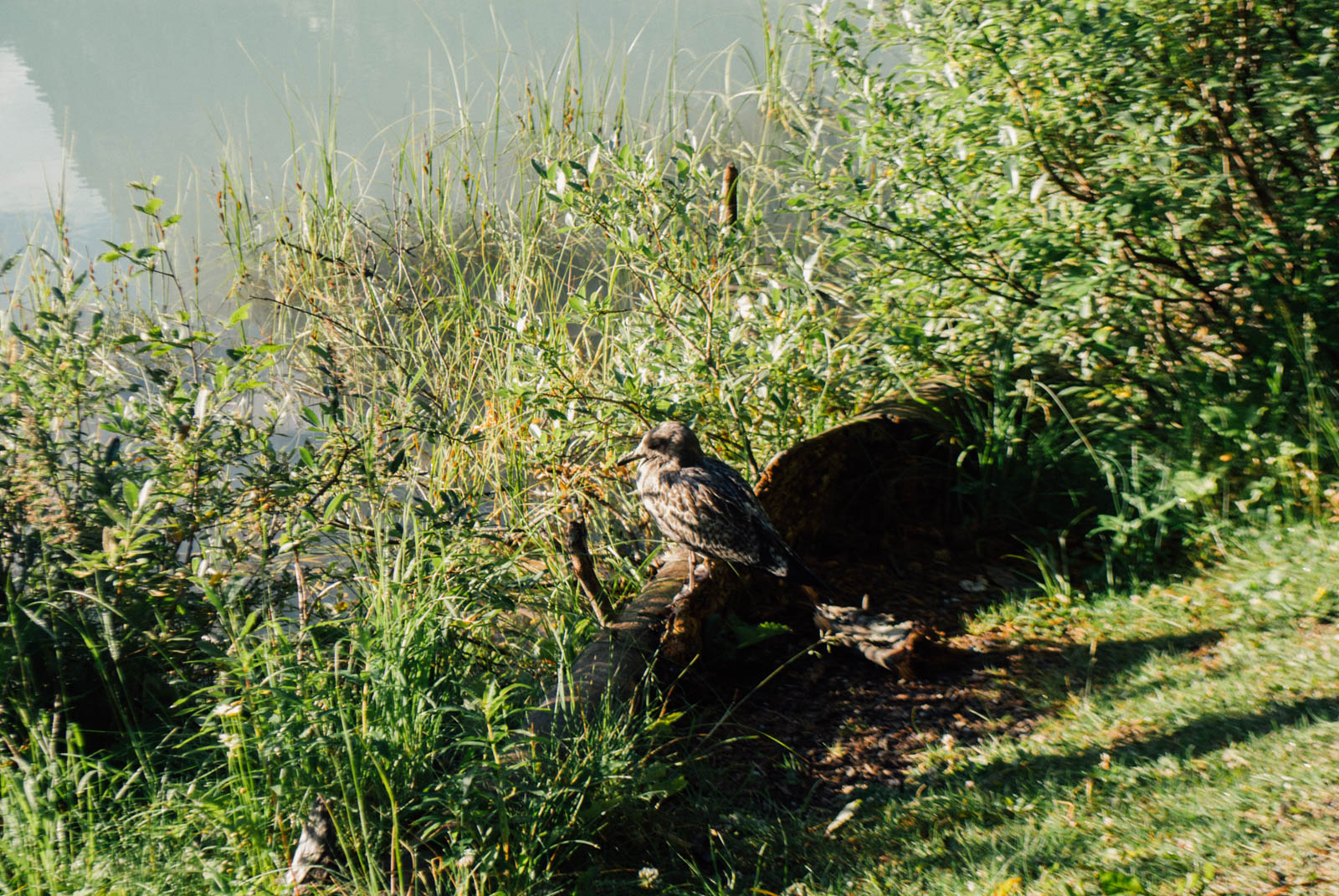 A little while after we stopped again on the road in a area that happened to be a camping site. Only as soon as we had parked the car we noticed that in other cars nearby people were weaving at us… yup, there was a bear only a few meters away, giving a rough time to the bushes. Remember how only the previous day we had been so irritated by the careless tourist that did the same thing — well, consciously, alas. If it wasn't for the other folks I don't think we would have noticed! (We were about to leave).