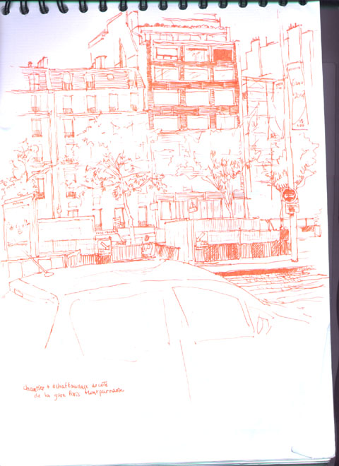 Pareil pour ce croquis, vu comme ça il a l'air d'être casse-cou, long et tout à faire... mais au fond, c'est rien que du très simple : je dessine ce que je vois, pas besoin de me creuser la tête, et qu'est-ce qu'une demi-heure comparée à des soirées à se prendre la tête à construire qqchose qui me dépasse...