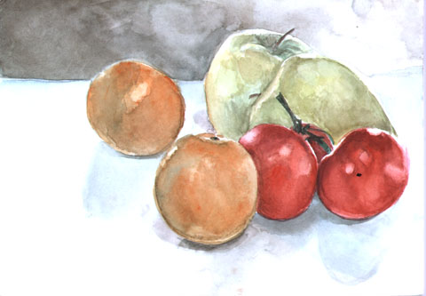 Et là vous vous dites mais qu'est-ce qu'elle fout cette conne, pourquoi elle poste une nature morte ?? En fait, il s'agit d'un post-it mental : "rappelez-moi de faire des illust avec cette technique". Technique dont j'ai fait une pause totale de 1 an, m'étant lancée dans la peinture "solide" l'été 2006. Cette petite compo pas si anodine que ça au final est la preuve que j'ai quand même des cours reposants, ouf !