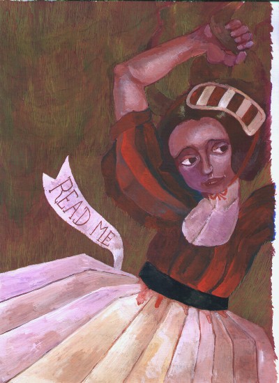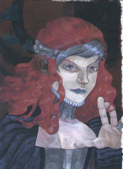 Une fée chèvre comme à mon habitude, et pourtant je ne suis pas allée à la montagne cette année... Ce qui change en revanche c'est le type de la peinture, un portrait, une fois n'est pas coutûme. C'est d'ailleurs pour cela que je le poste prématurément : un premier essai, ce n'est pas sans difficultés : prière aux généreux commentateurs de ne pas s'abstenir, j'ai des doutes sur l'expressivité du regard de la dame... et je ne sais plus comment faire le fond (j'ai peur que tenter une nature morte fasse trop chargé alors que le vide restant est si... restreint.