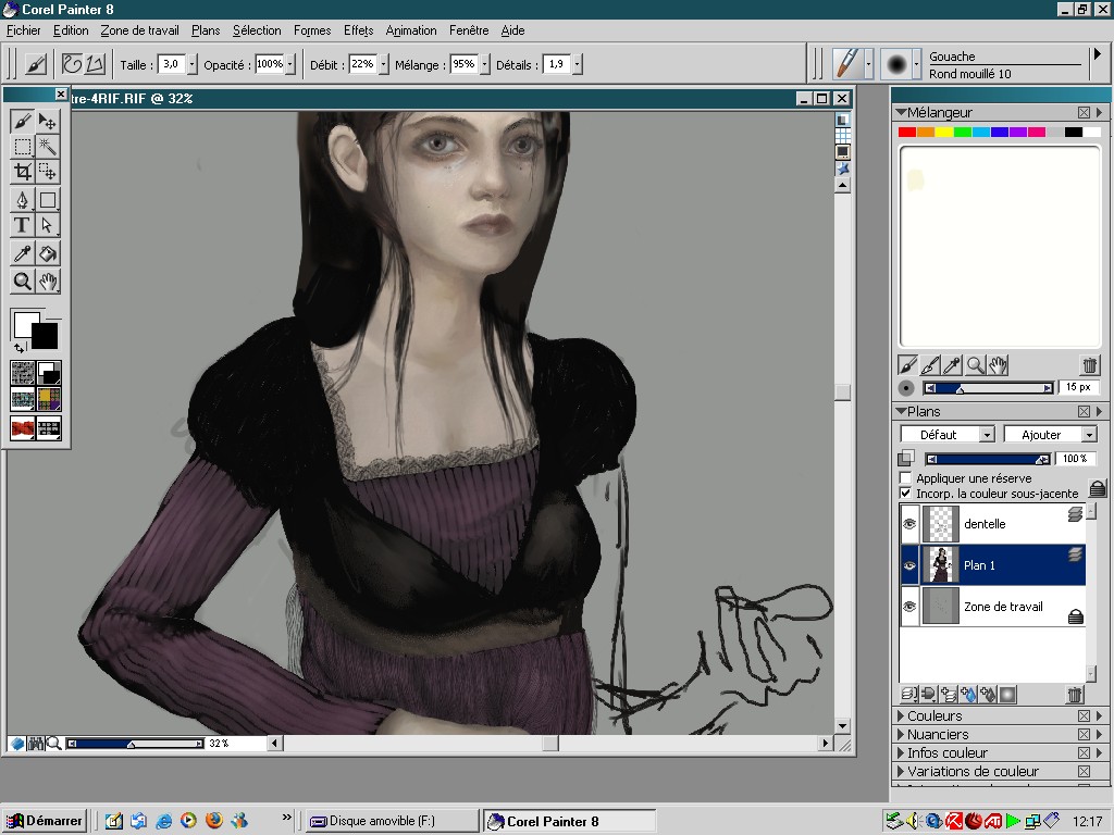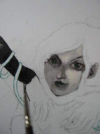 Last but not least, mon travail en cours sur Painter qui avance aussi vite que mes amis escargots vu que l'ordinateur sur lequel je le faisais, le mien en somme, a claqué tantôt. Un screen, sans le fond, sur lequel je ne me suis pas vraiment décidée : je pensais à une forêt, mais depuis le temps que je travaille sur cette image je m'étais habituée à cette prédominance grise & neutre...