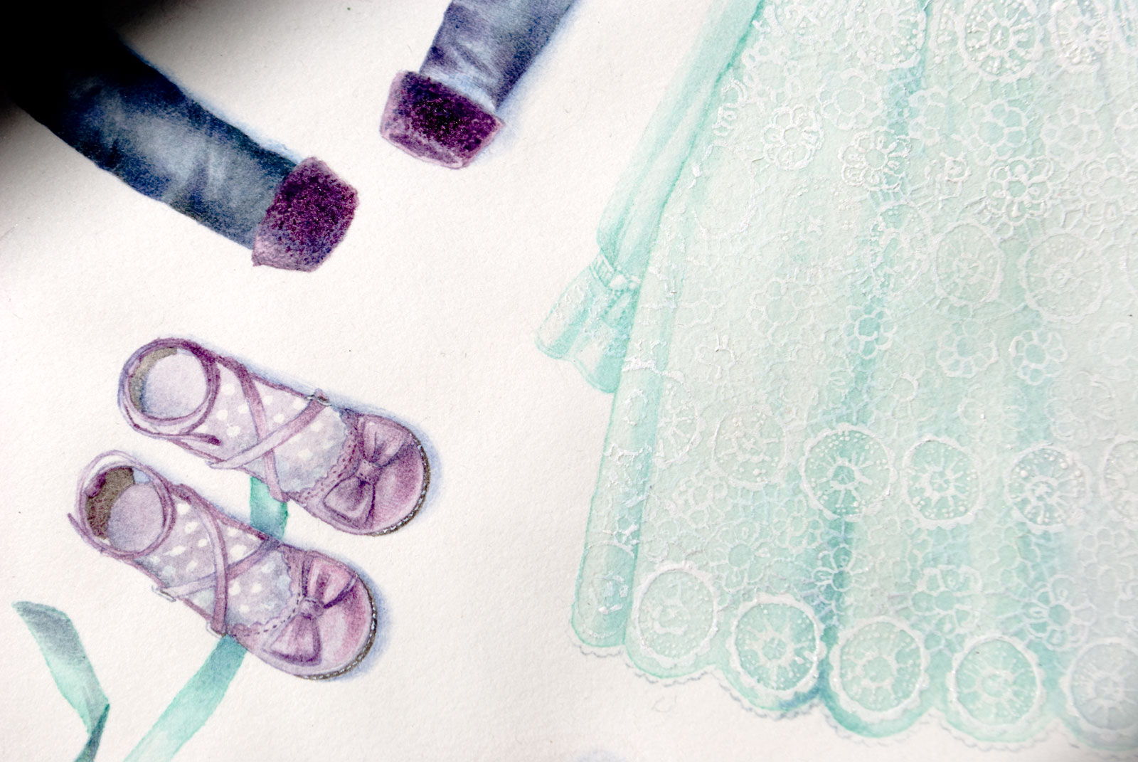 I might call it that, but from the South of France to the South of England I easily took a step further with this one, through the means of several Jane Austen novels and television adaptations read and watched during its making. Even the idea comes from a long way: I meant to paint it (especially this dress) since I first had the idea for my serie, but I had to follow the natural cycle of seasons — fresh mint and pastels were better suited to spring and summer so I made the witch and fae ones first. It's one of my rare illustrations featuring some bits of Sweet Lolita and quite possibly the only one with actual Angelic Pretty dress and shoes in it. I liked pairing it with early XIXth century as both use their fair share of empire waists. Do you remember seeing something like it on the late poupéegirl? It was very cute.