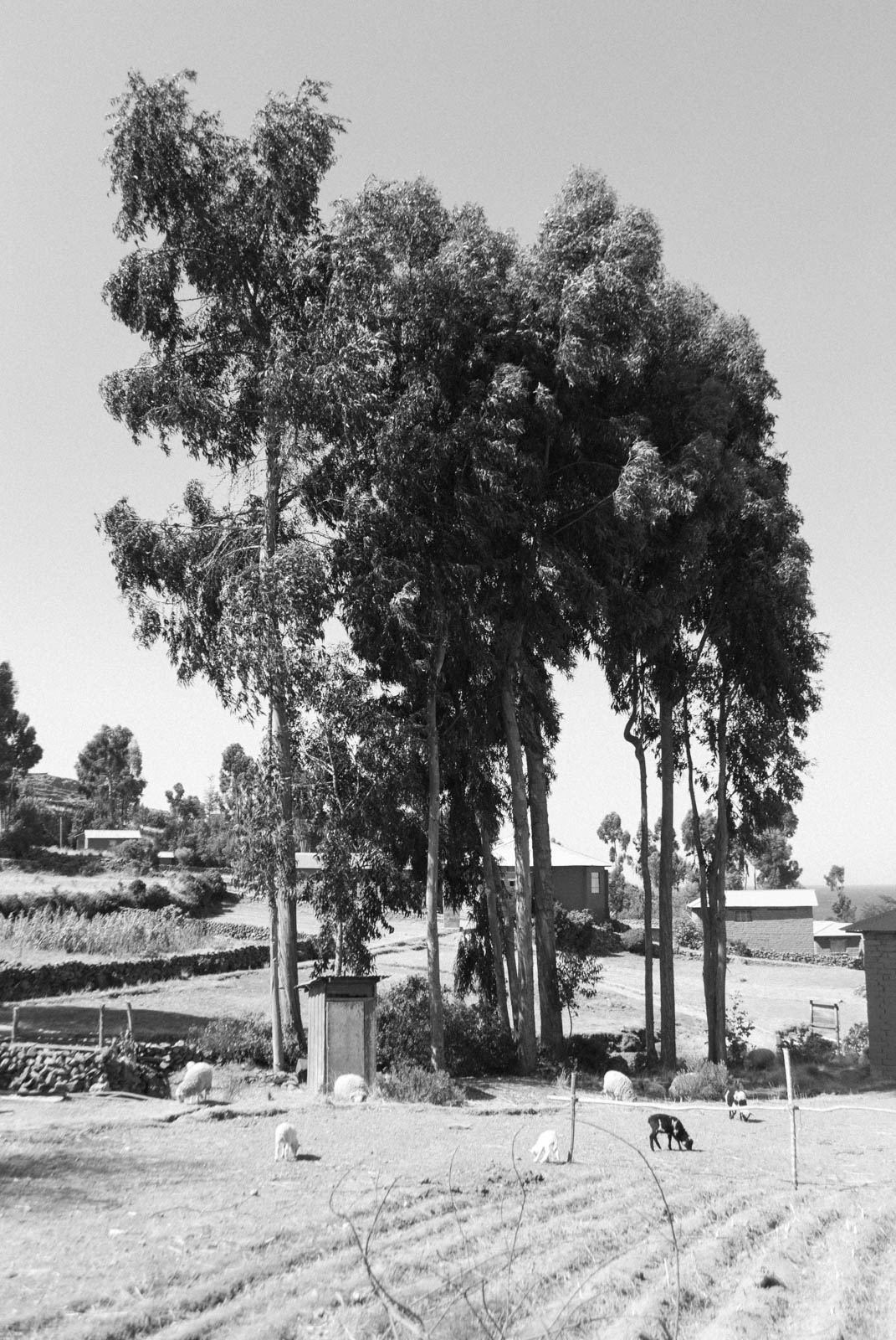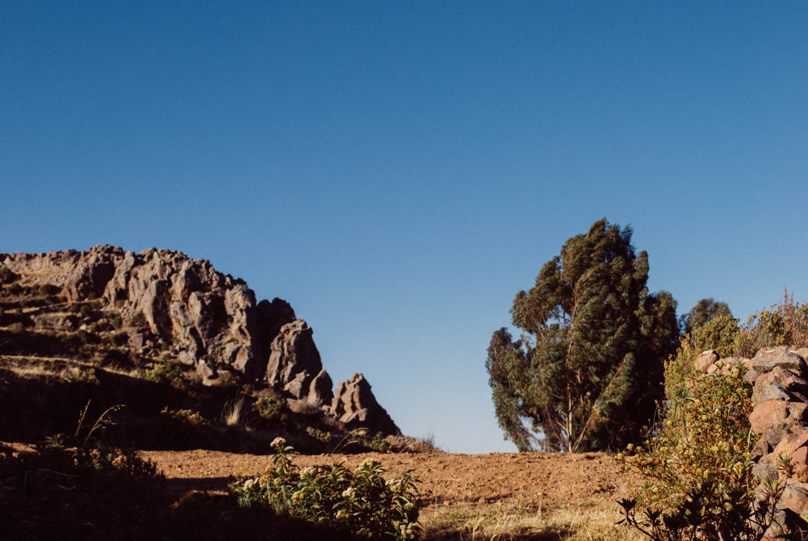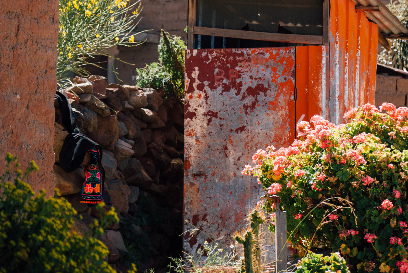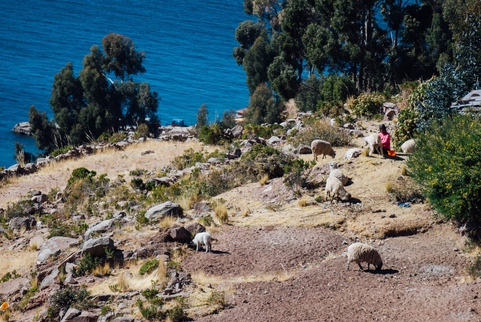 Si les Uros restaient encore bien proches de Puno, enclavées dans ce qu'on appelle le lac mineur qui donne lui-même dans le lac majeur par un détroit d'environ 900m, l'île d'Amantani où se déroulait la grande partie de l'excursion était elle au delà de ce détroit, même si toujours dans les eaux péruviennes (ce lac est si grand qu'en vérité il se trouve à cheval entre le Pérou et la Bolivie). Même s'il faisait très beau, à mon grand soulagement vu les nuages noirs que j'avais vu s'amonceler la veille en arrivant en bus, le climat n'était pas si génial que ça pour la navigation et nous avons abordé l'île par un endroit imprévu. Corollaire, une fois débarqués une floppée de mamas prévenues à la dernière minute sont arrivées en courant nous accueillir et nous avons été répartis dans des familles, coupant notre groupe de 6 en deux tout de même — ça tombe bien, on était deux à parler l'espagnol même si la langue locale serait plutôt le quechua (les habitants des Uros étaient eux des Aymaras parlant donc… l'aymara, les précédents insulaires ayant donné leur nom aux archipels s'étant éteints en 1959). La grimpette nous a un peu assassinés, bien que les mamas la fassent les mains dans les poches, ou plutôt les mains partout sauf dans les poches car pourquoi rester oisif quand on peut filer la laine en marchant ? Finalement nous nous sommes installés dans nos quartiers, et peut-être à cause du changement de programme, nous n'avons pas eu à déranger les mamas dans leurs occupations donc j'en ai profité pour prendre quelques photos avant de déjeuner :