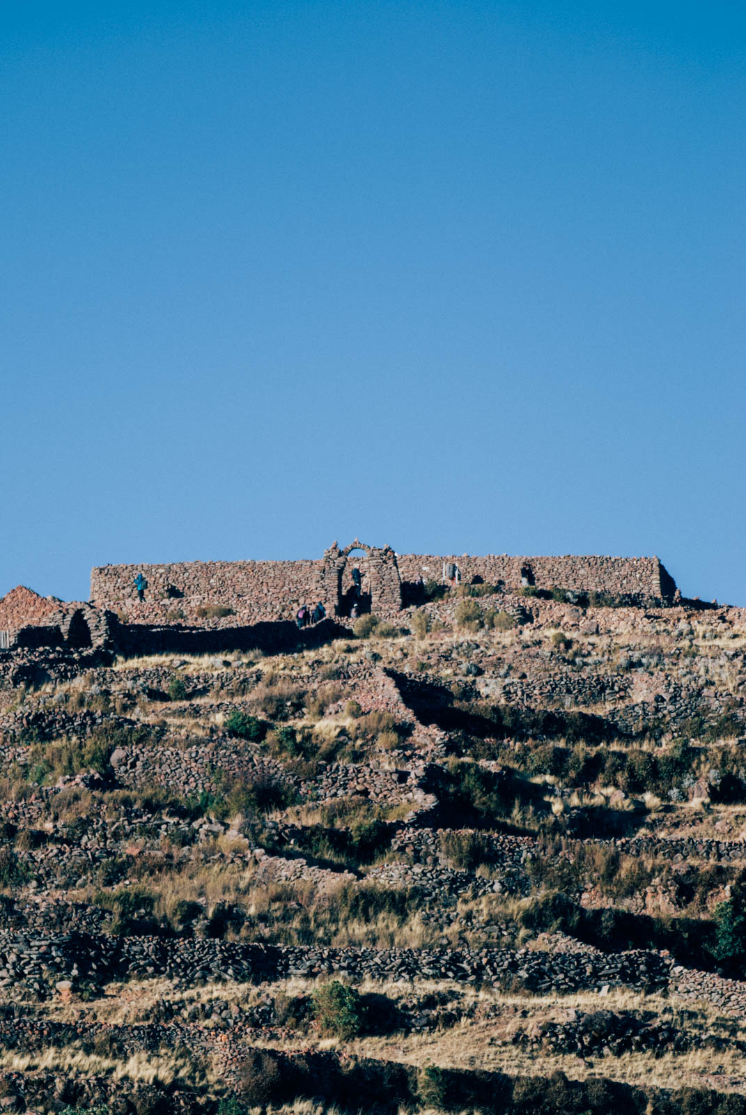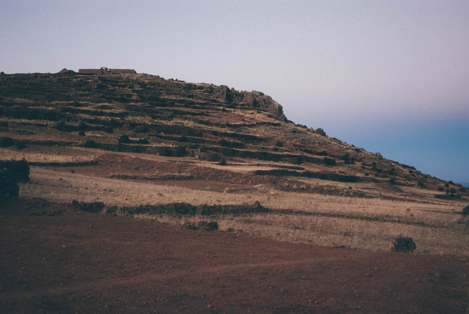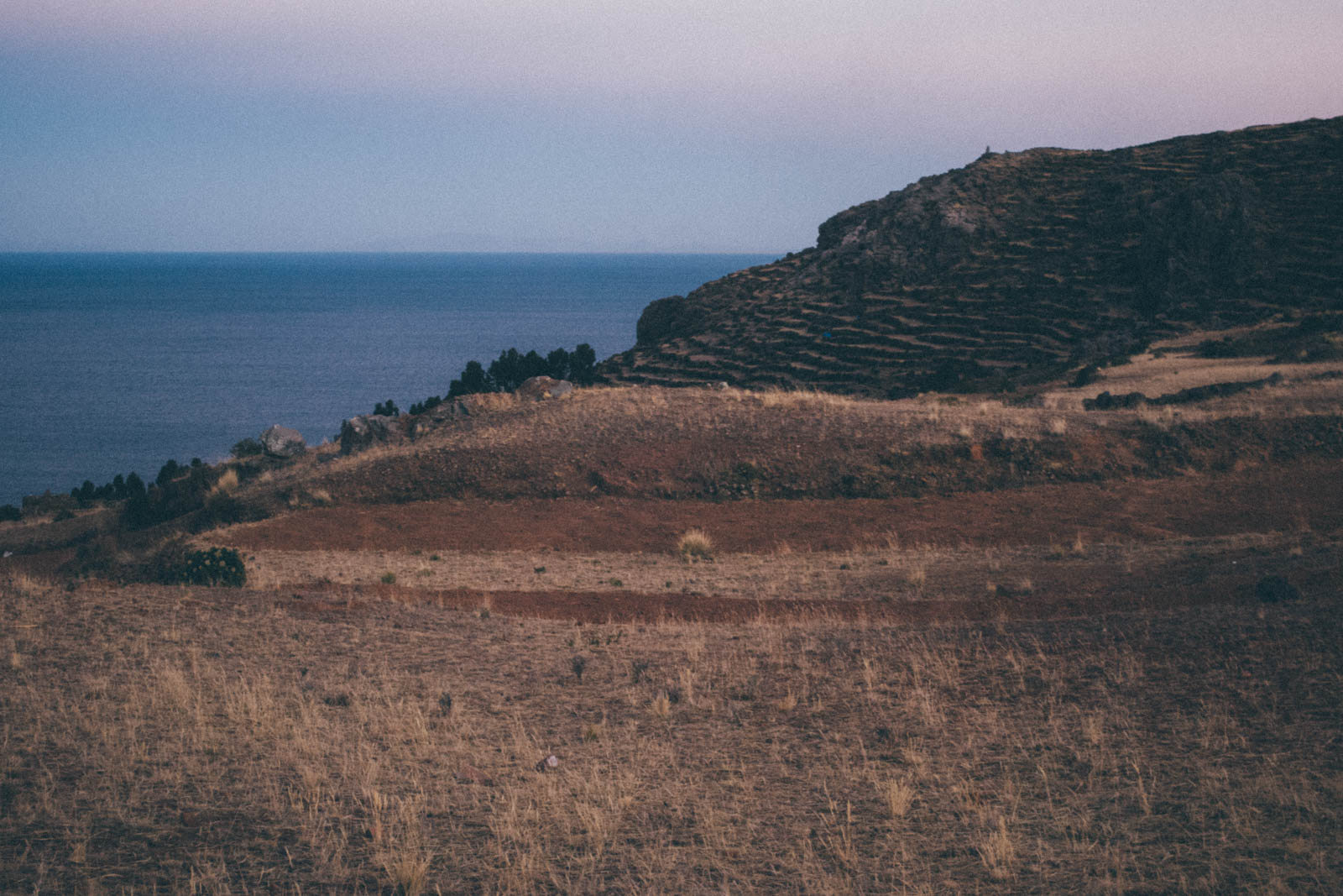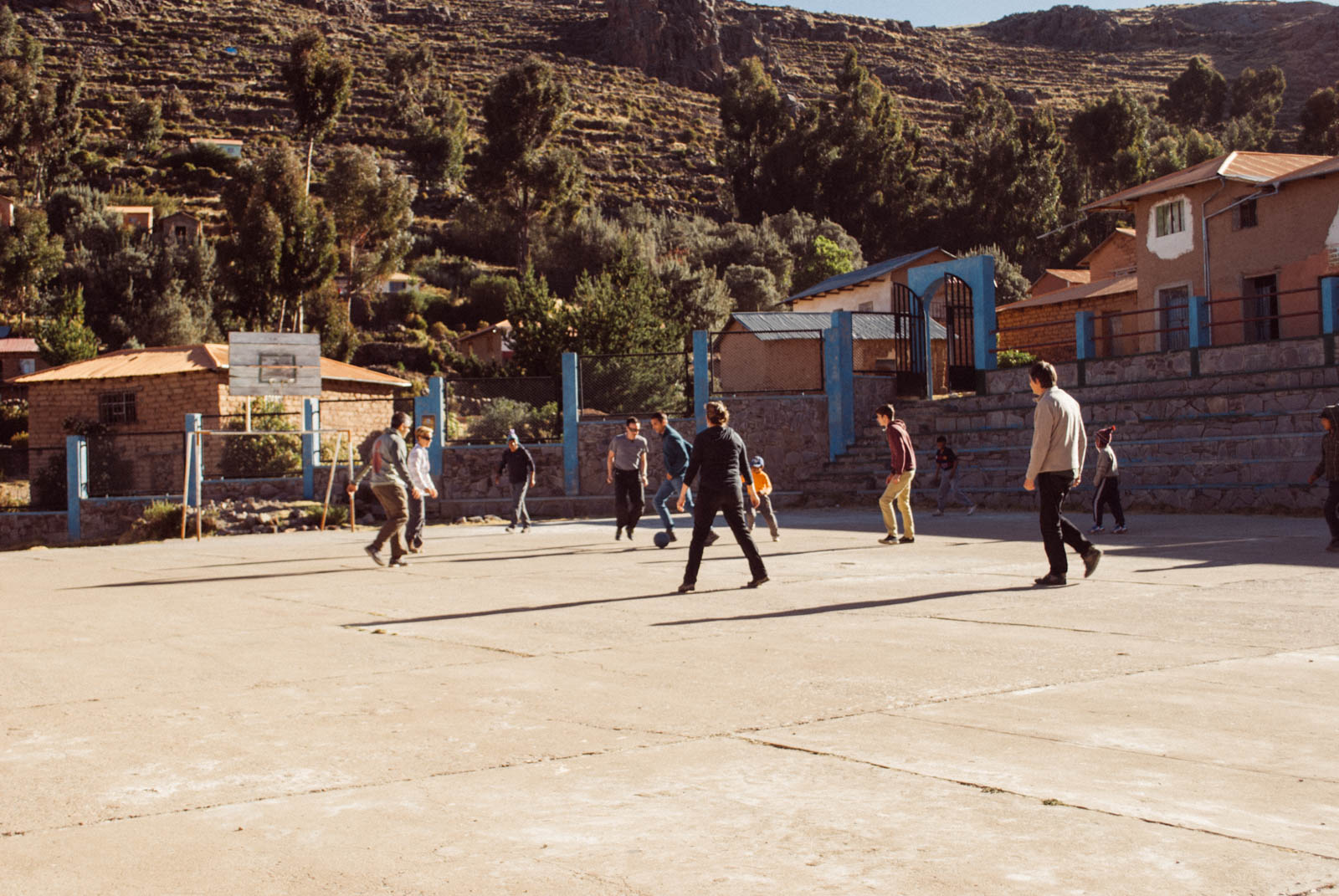 Peu après notre (très bon) guide nous a fait monter en haut du village et nous a parlé un peu des coutumes locales. Il nous a déballé quelques produits cultivés sur l'île, des pommes de terre, de l'oca du Pérou, de la quinoa etc. Puis il a convié ceux que ça intéressait à une partie de foot avec quelques enfants du village. Et après que tout ce monde ait donné jusqu'à son dernier souffle dans cette activité… il les a fait monter jusqu'aux plus hautes parties de l'île battues par un vent de tous les diables, afin d'admirer le coucher du soleil depuis un des deux temples en ruines présents, celui du Pachatata et celui du Pachamama — ce dernier étant moins venteux il fut l'heureux élu.