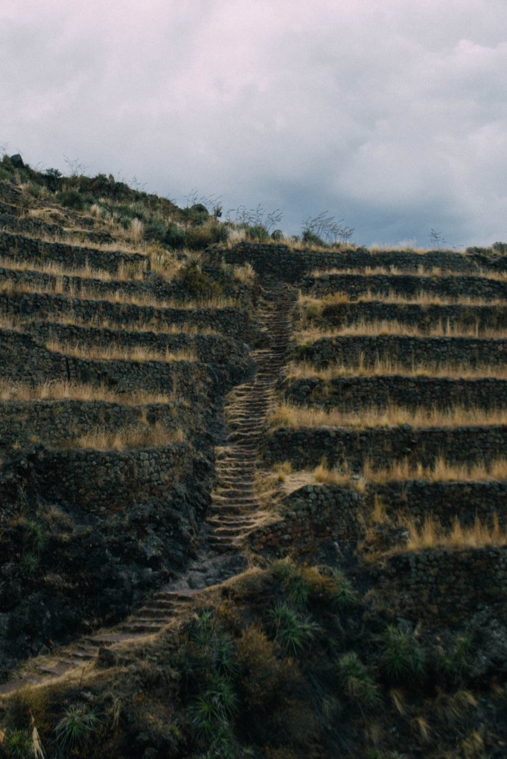 En revenant d'Ollantaytambo, nous avons essayé de nous rendre à Pisac avant de définitivement revenir à Cusco mais la malhonnêteté d'un des conducteurs de véhicules du coin a reporté cette expédition au lendemain. En plus de ne pas hésiter à mentir sur la durée du voyage afin de bourrer à craquer son bus (on pourrait croire que vendre toutes ses places assises lui aurait suffit), le coquin a également fait montre d'une soudaine surdité au moment de rendre la monnaie sur le prix du trajet – affaire que je n'ai pas lâchée, bien sûr – et quoi qu'il en soit nous sommes arrivés à une heure bien avancée dans cette ville et avons décidé de reprendre immédiatement un collectivo pour Cusco. Hélas, le lendemain nous avons à peine eu plus de chance. Sans doute l'écriteau à vendre sur la vitre arrière aurait du suffire à nous faire fuir, mais peu enclins à tenter un autre voyage morcelé, nous avons accepté l'offre chère mais combinée d'un vieux bonhomme (sûrement plus jeune que son mini-bus toutefois) et malgré quelques inquiétudes quant à la vitesse du véhicule dans les côtes, nous avons tout de même pu profiter des ruines de Pisac avant la tombée de la nuit.