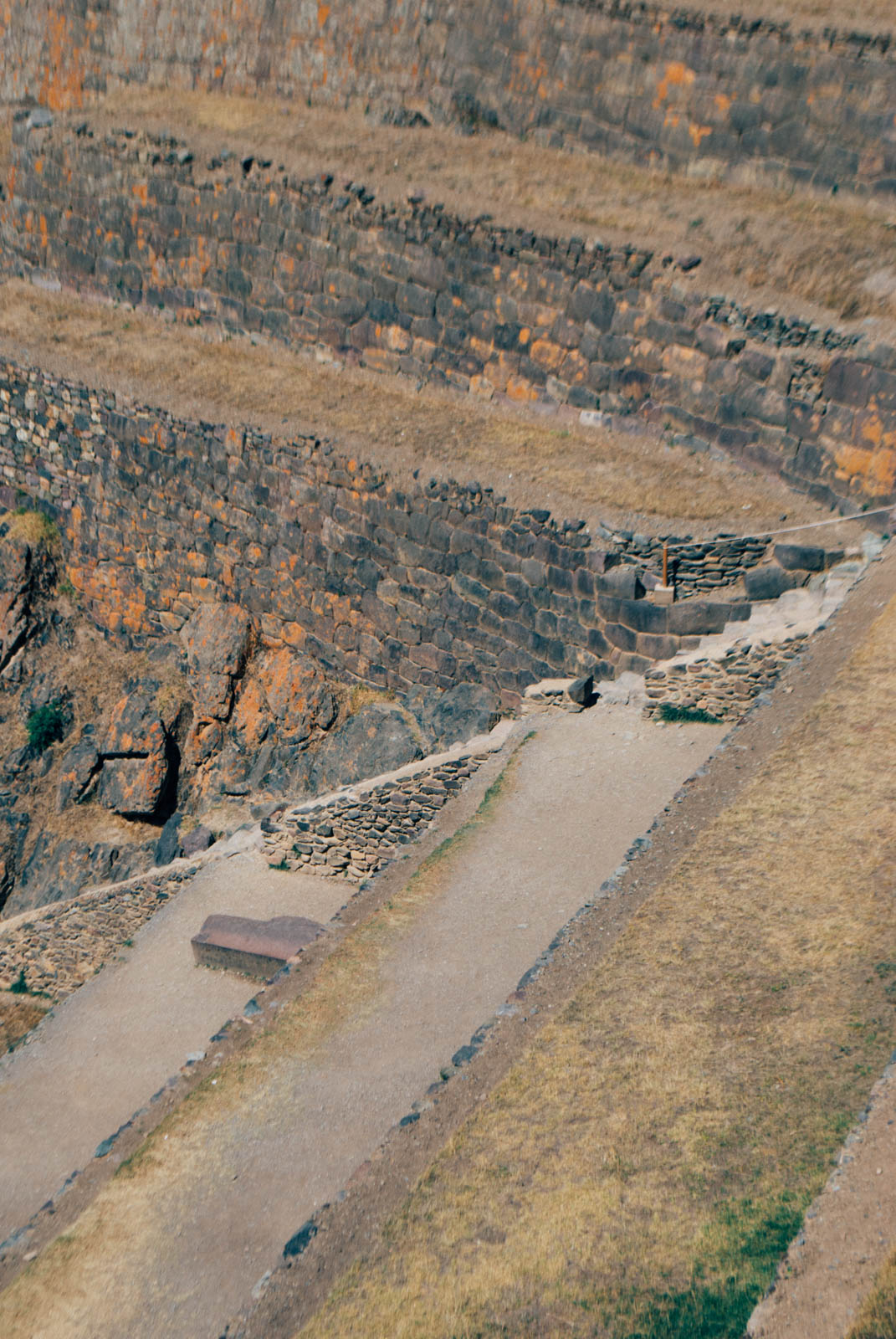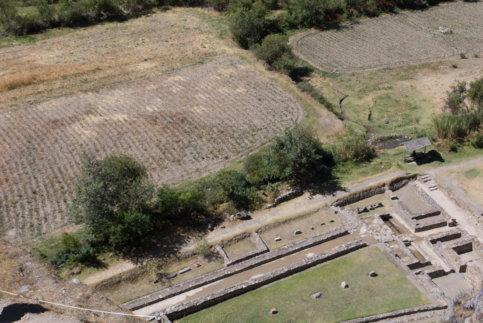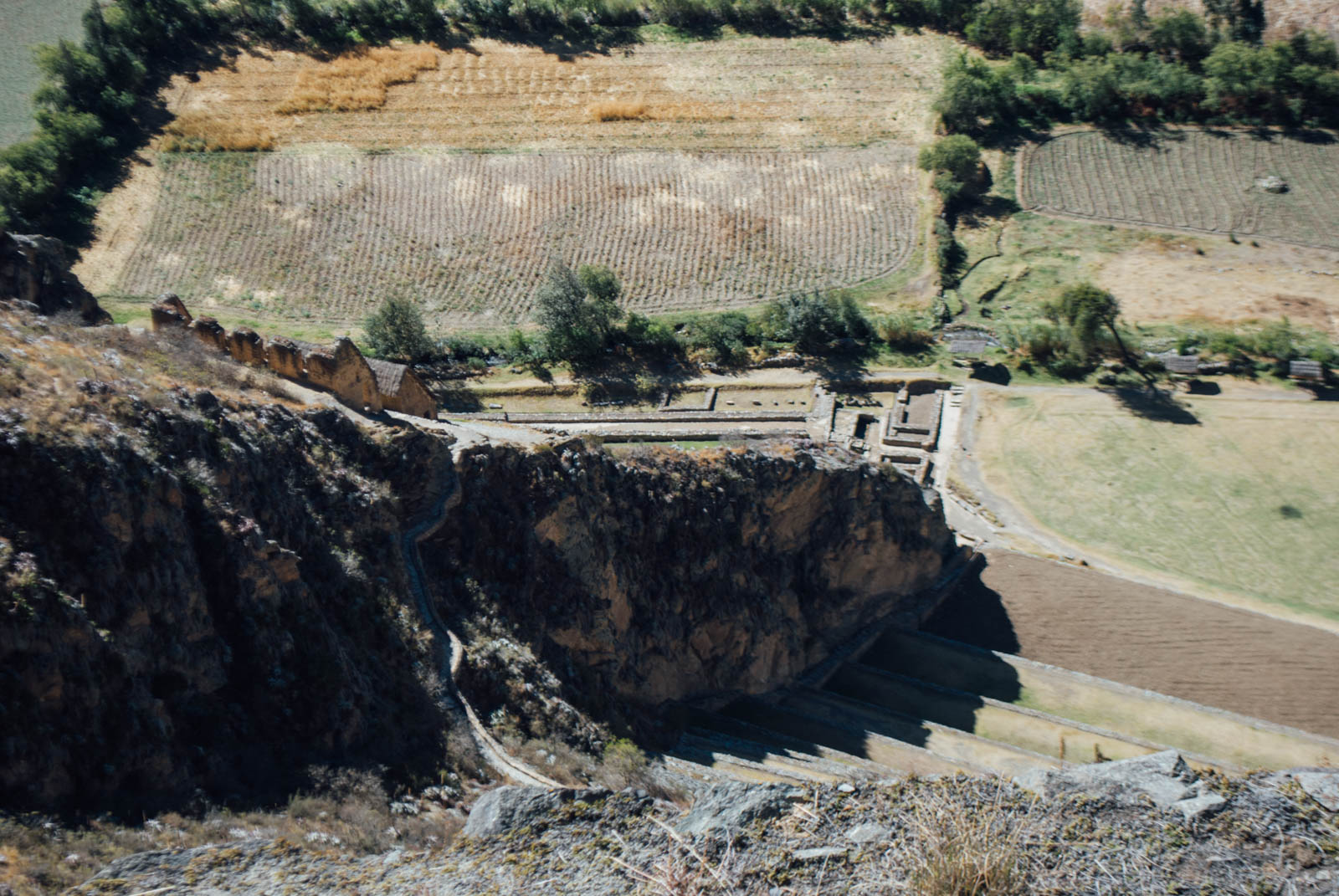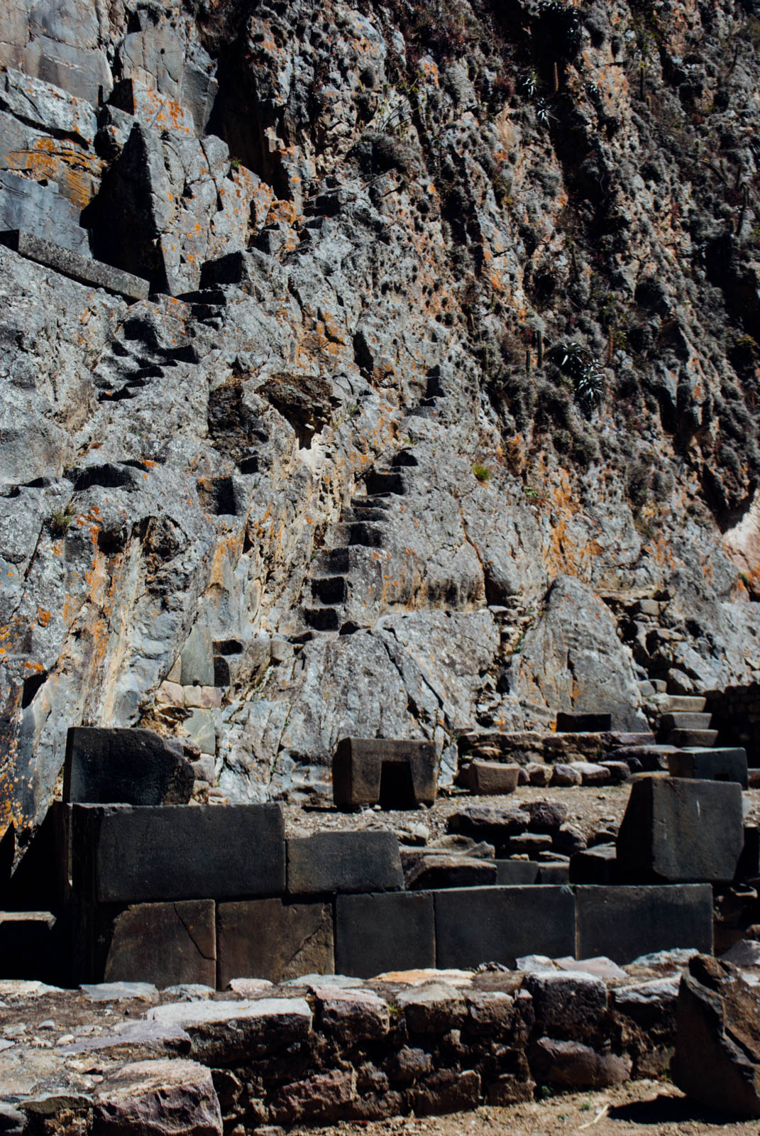 En revenant sur nos pas nous avons ainsi continué la visite dans les ruines jusqu'à arriver à un endroit assez étrange où l'on pouvait voir un entremêlement anarchique de blocs de pierre partiellement taillés et d'escaliers à flanc de paroi plus ou moins fonctionnels selon leur étroitesse; sans nul doute une carrière. Et en face, c'est ce qu'on peut voir sur la photo précédente, prise en hauteur : des bains incas et leur système d'irrigation, dérivé de la rivière qui coule derrière la masse d'arbres.