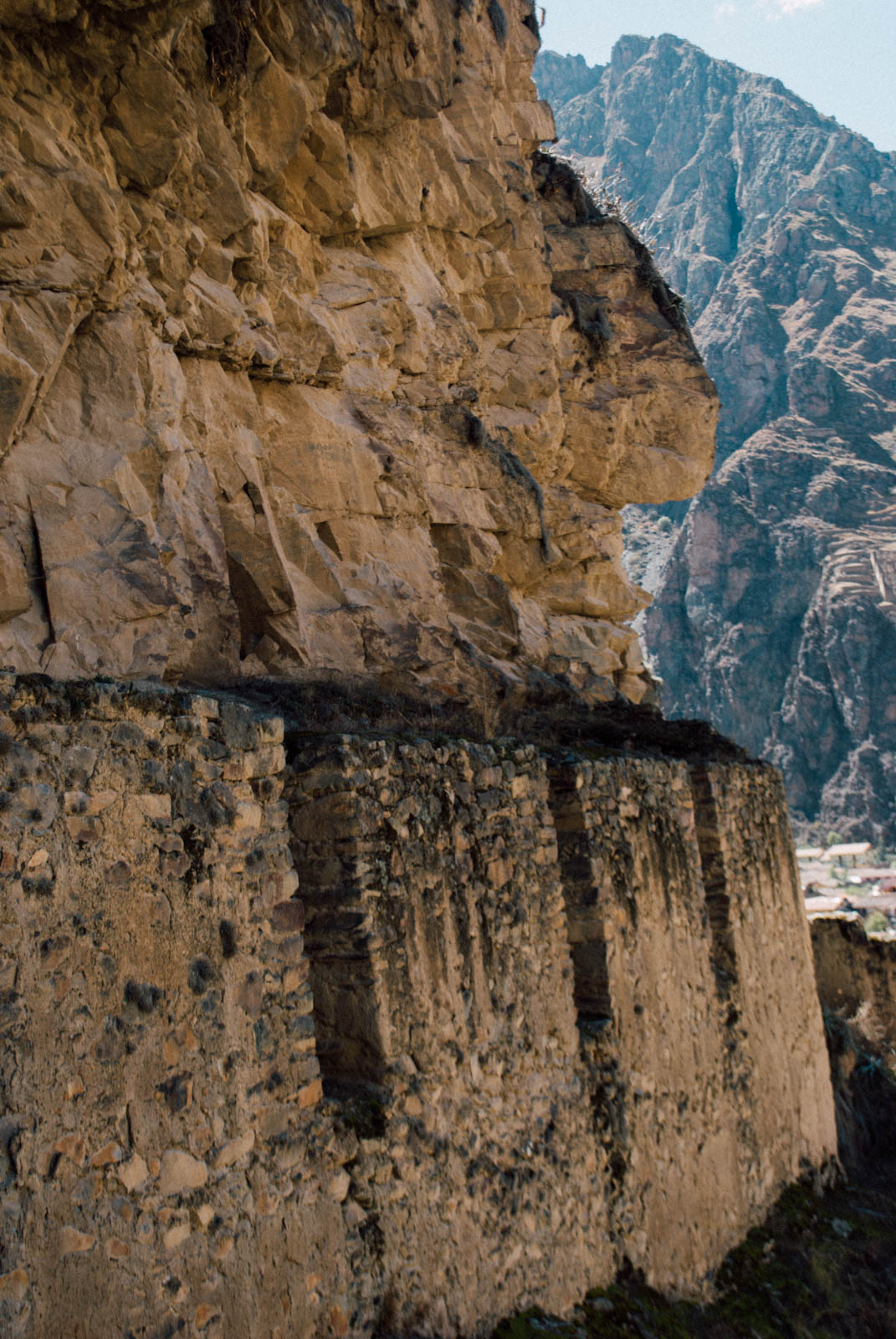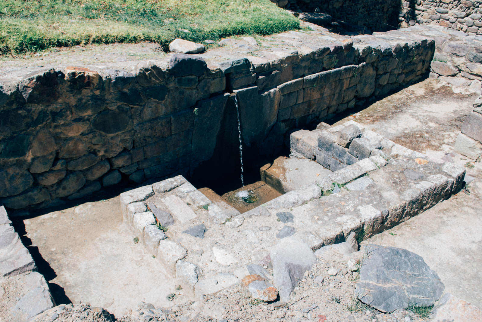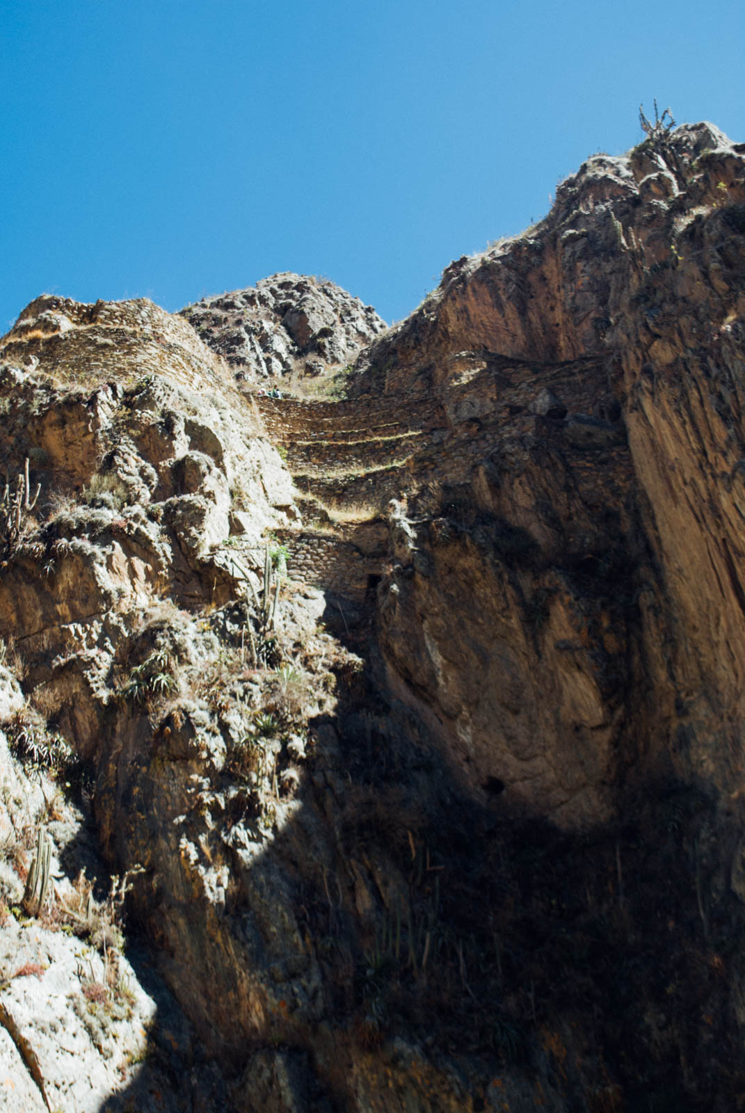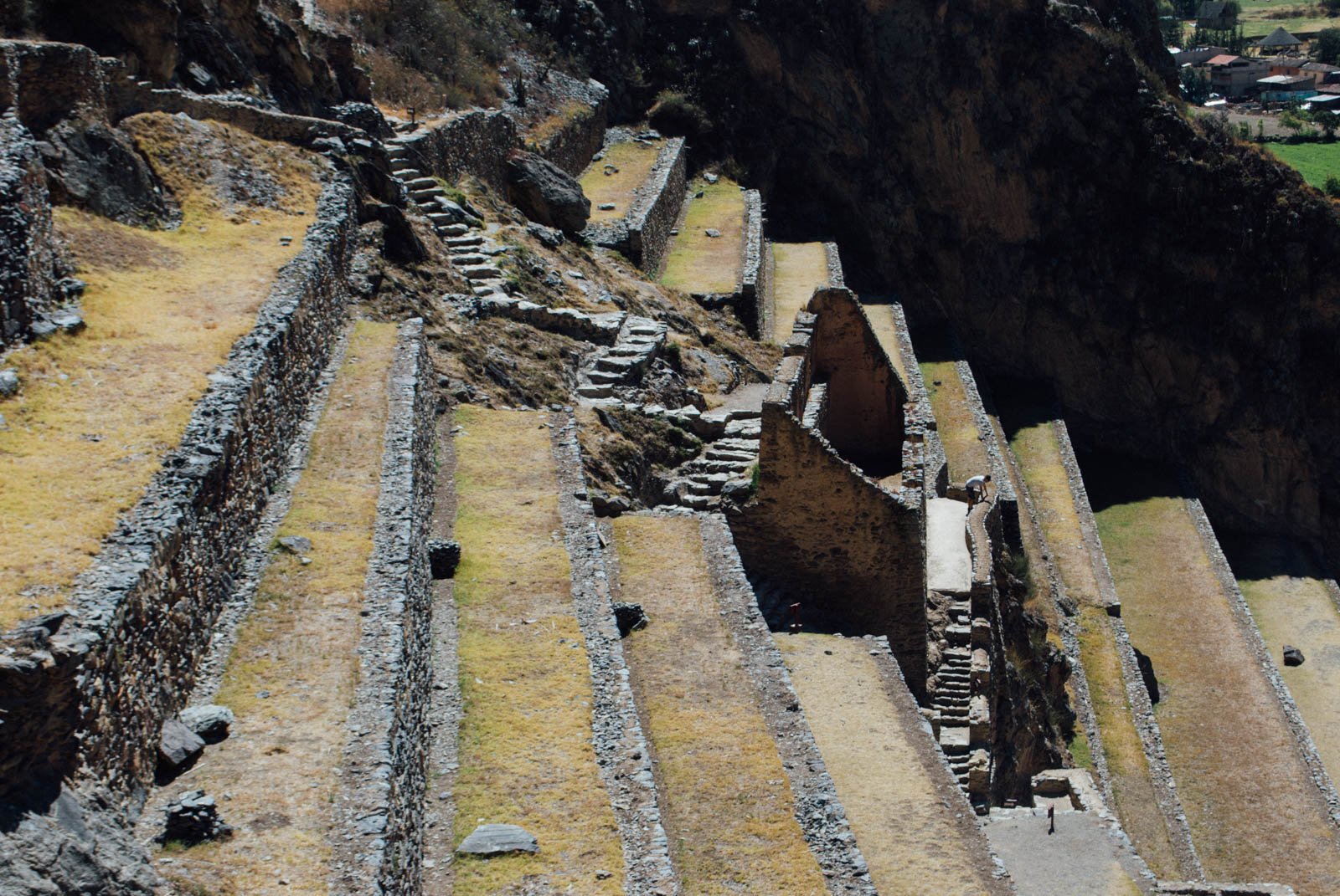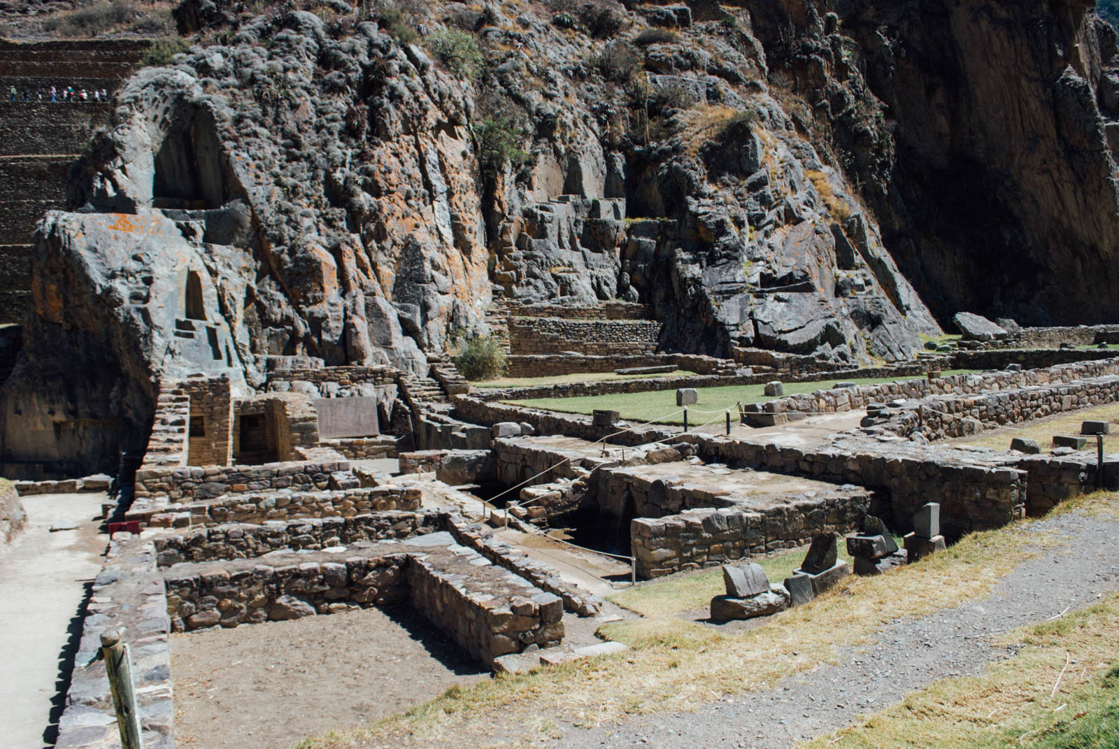En revenant sur nos pas nous avons ainsi continué la visite dans les ruines jusqu'à arriver à un endroit assez étrange où l'on pouvait voir un entremêlement anarchique de blocs de pierre partiellement taillés et d'escaliers à flanc de paroi plus ou moins fonctionnels selon leur étroitesse; sans nul doute une carrière. Et en face, c'est ce qu'on peut voir sur la photo précédente, prise en hauteur : des bains incas et leur système d'irrigation, dérivé de la rivière qui coule derrière la masse d'arbres.