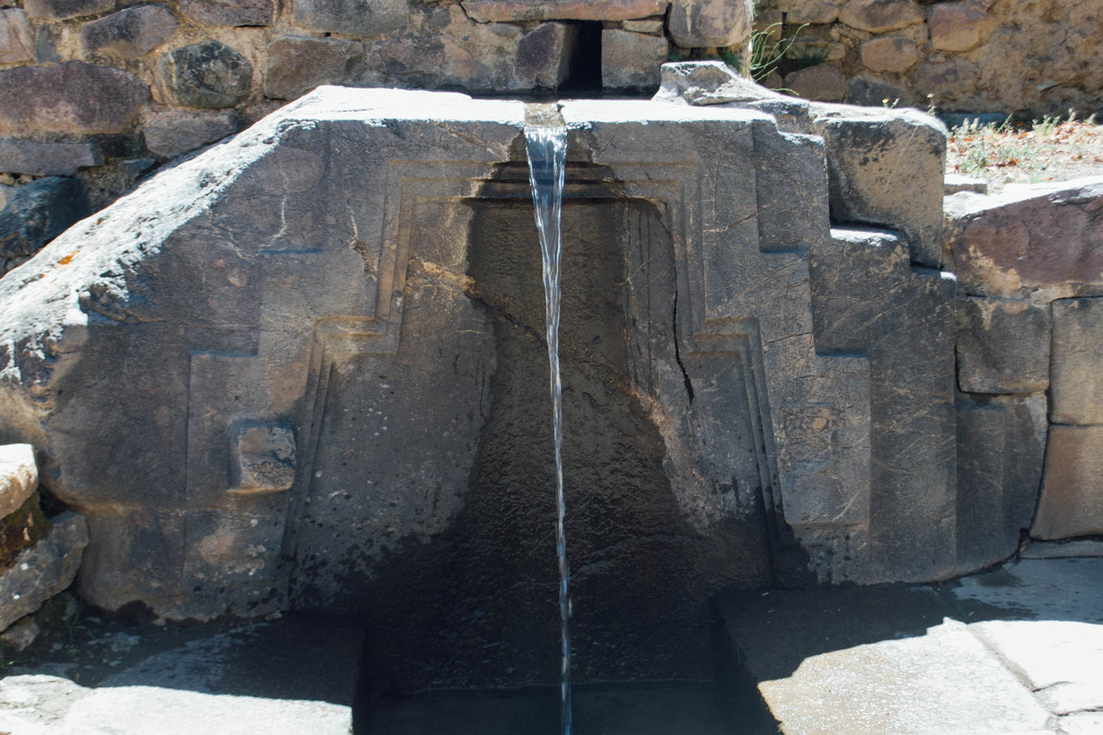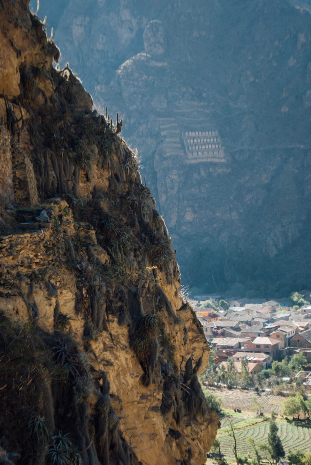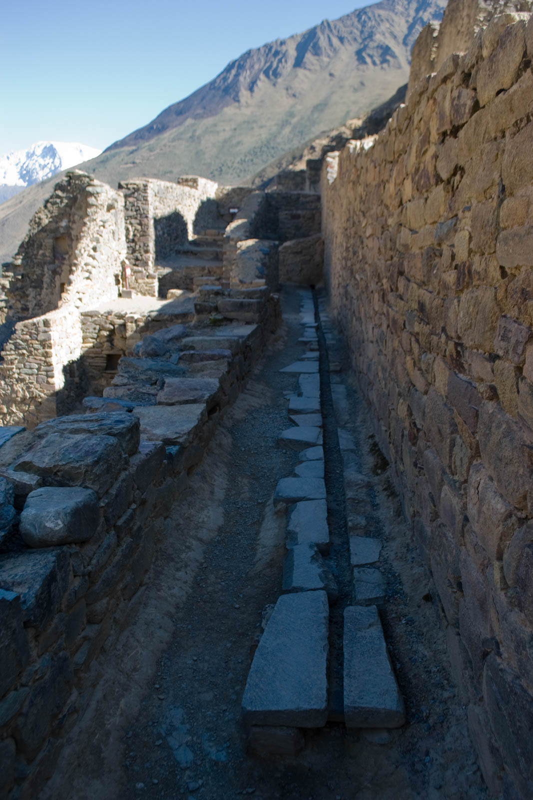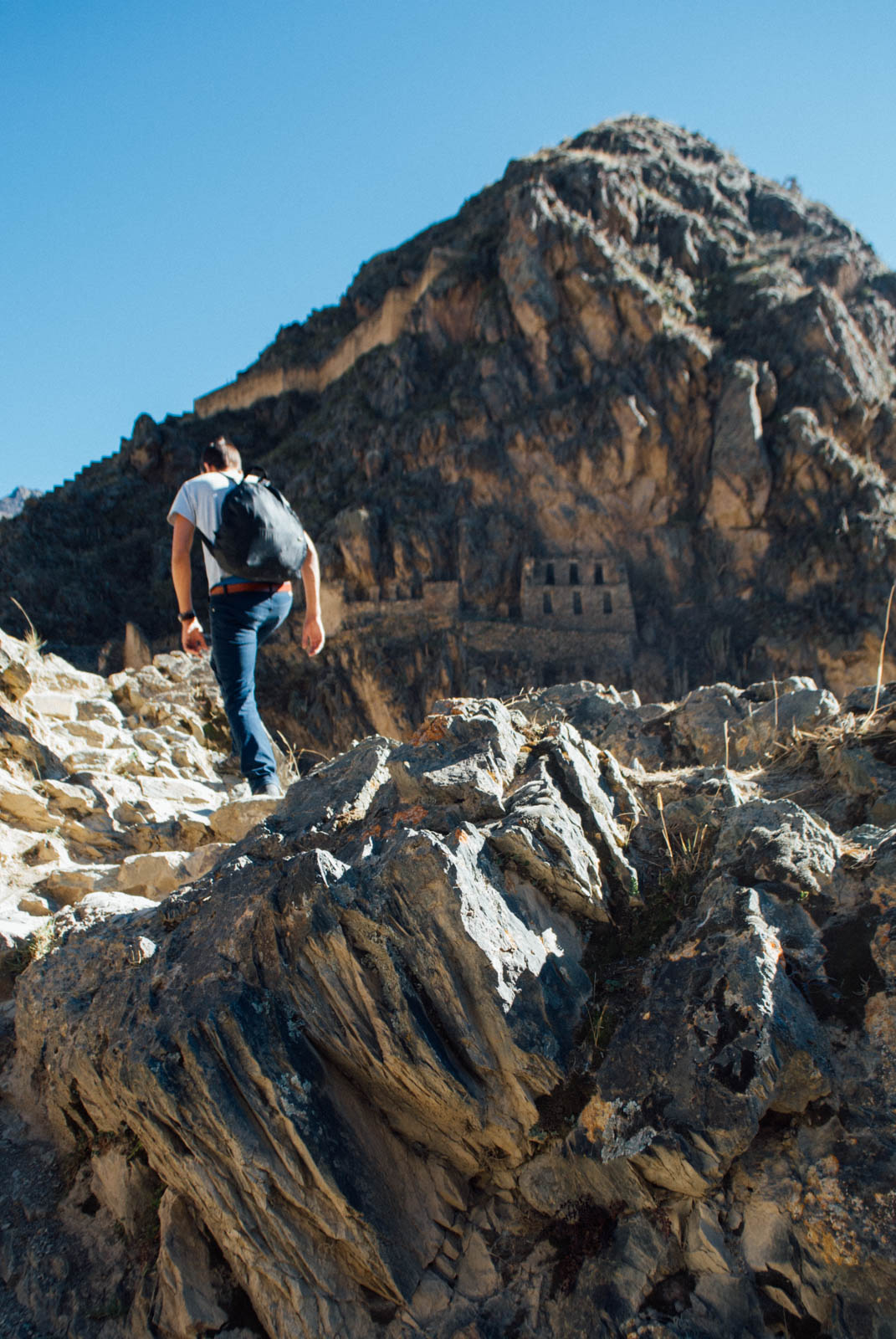 En revenant sur nos pas nous avons ainsi continué la visite dans les ruines jusqu'à arriver à un endroit assez étrange où l'on pouvait voir un entremêlement anarchique de blocs de pierre partiellement taillés et d'escaliers à flanc de paroi plus ou moins fonctionnels selon leur étroitesse; sans nul doute une carrière. Et en face, c'est ce qu'on peut voir sur la photo précédente, prise en hauteur : des bains incas et leur système d'irrigation, dérivé de la rivière qui coule derrière la masse d'arbres.