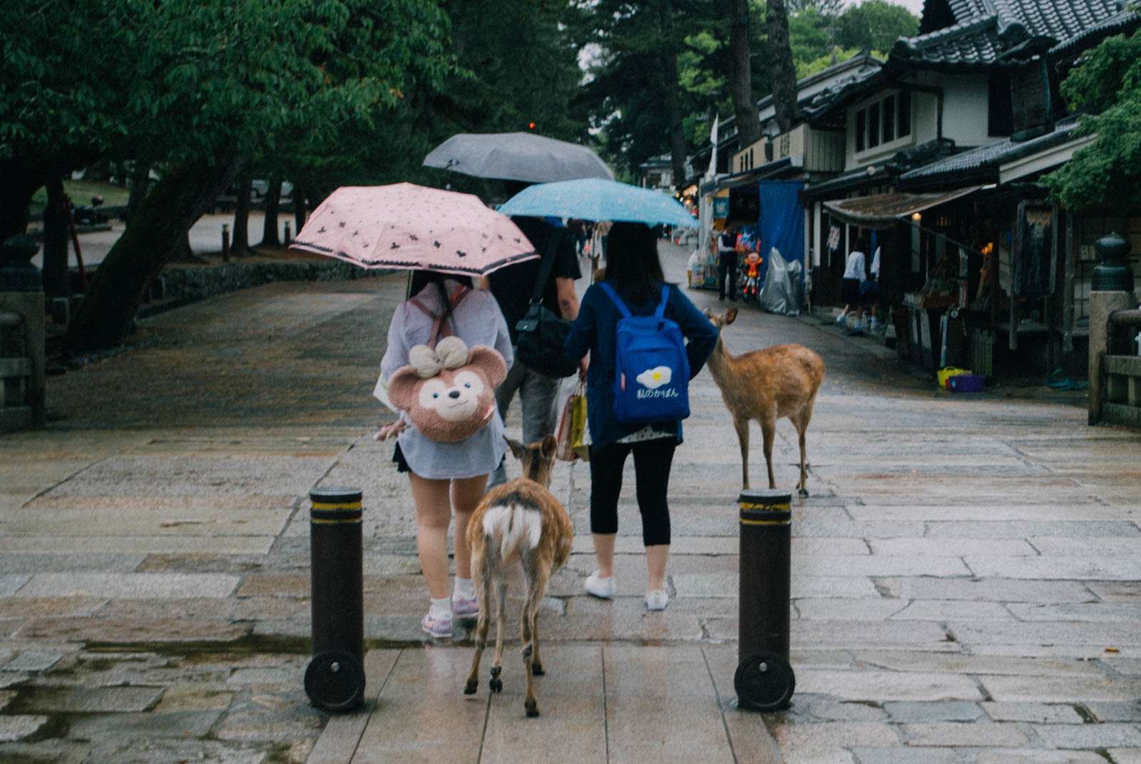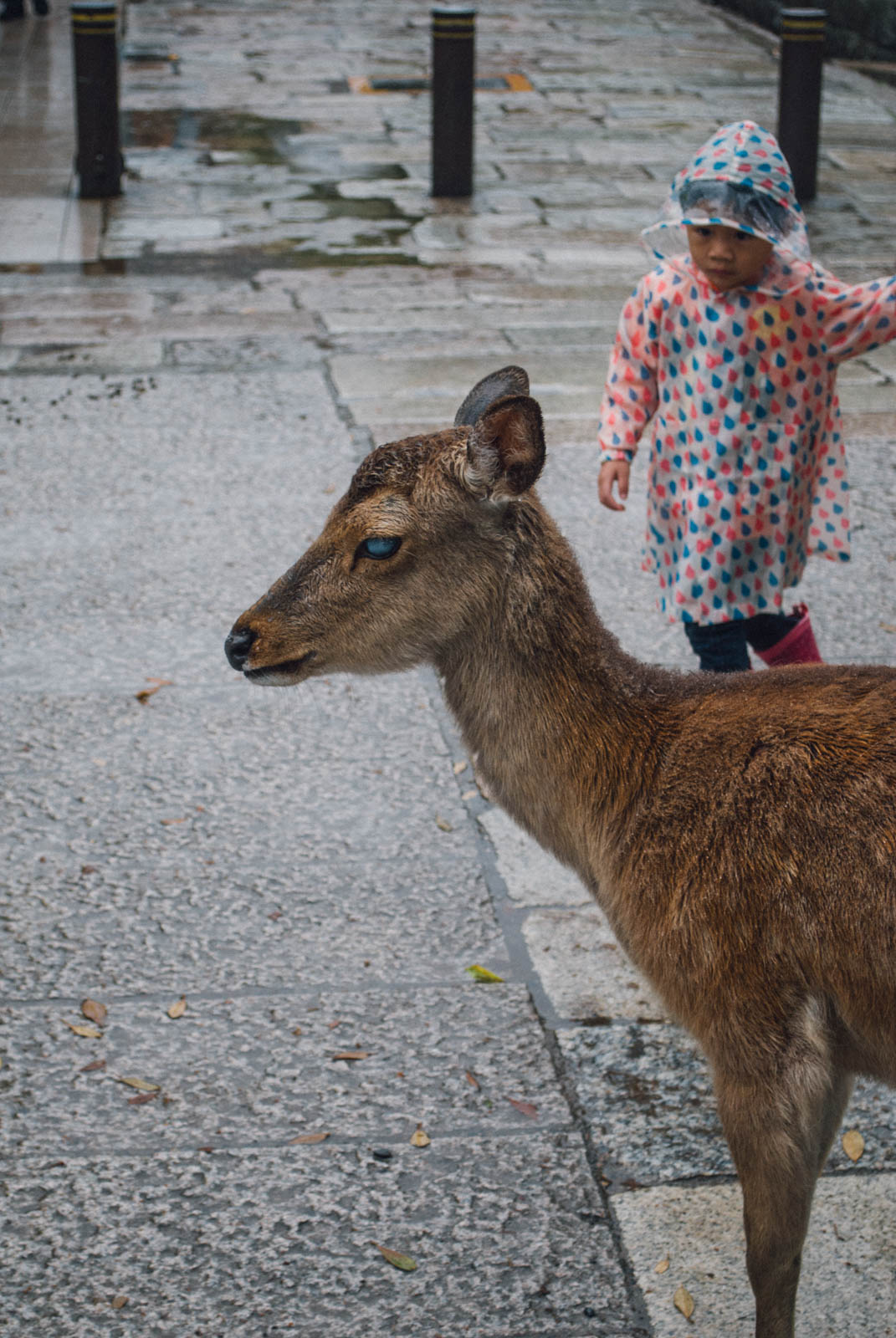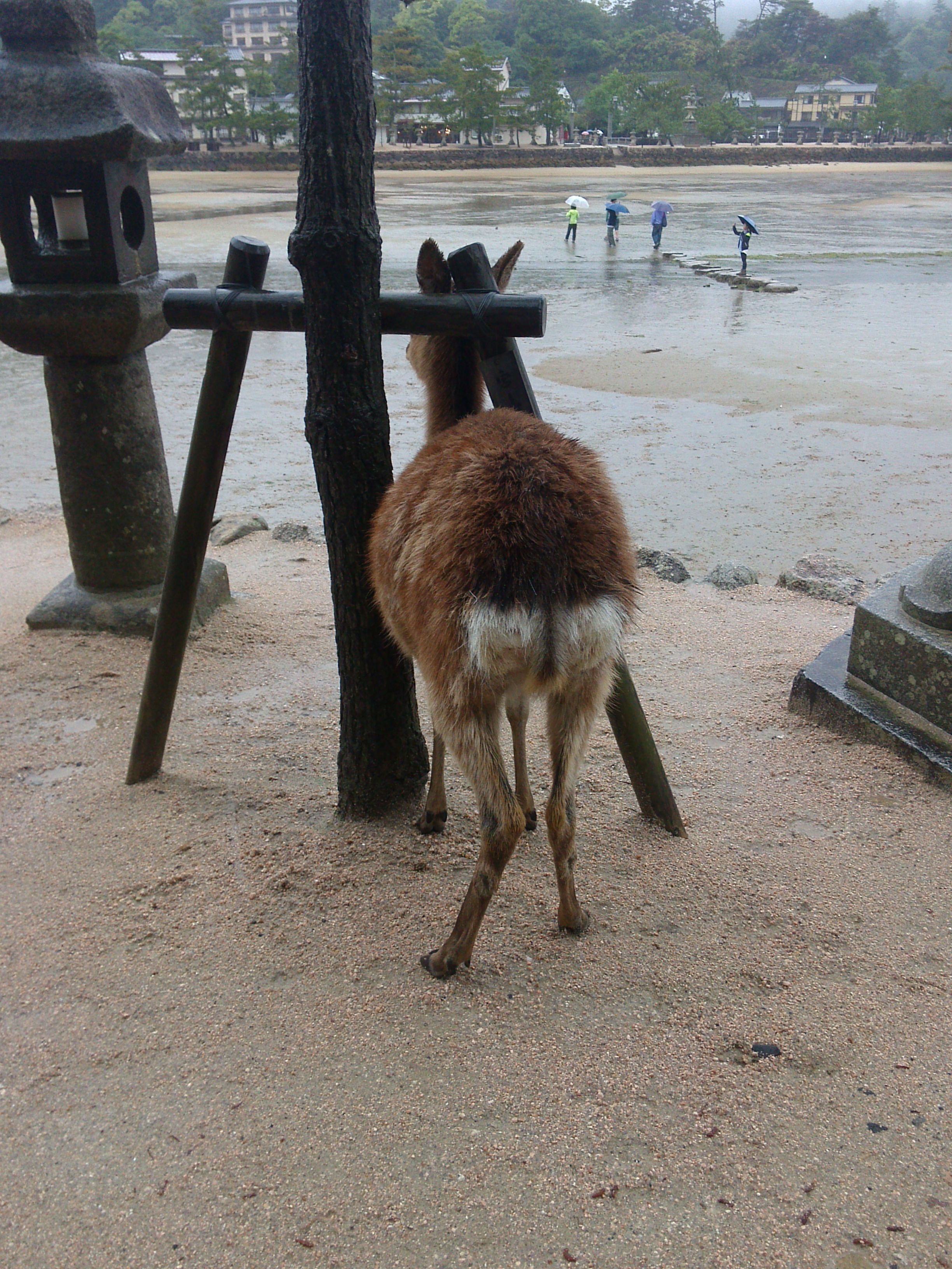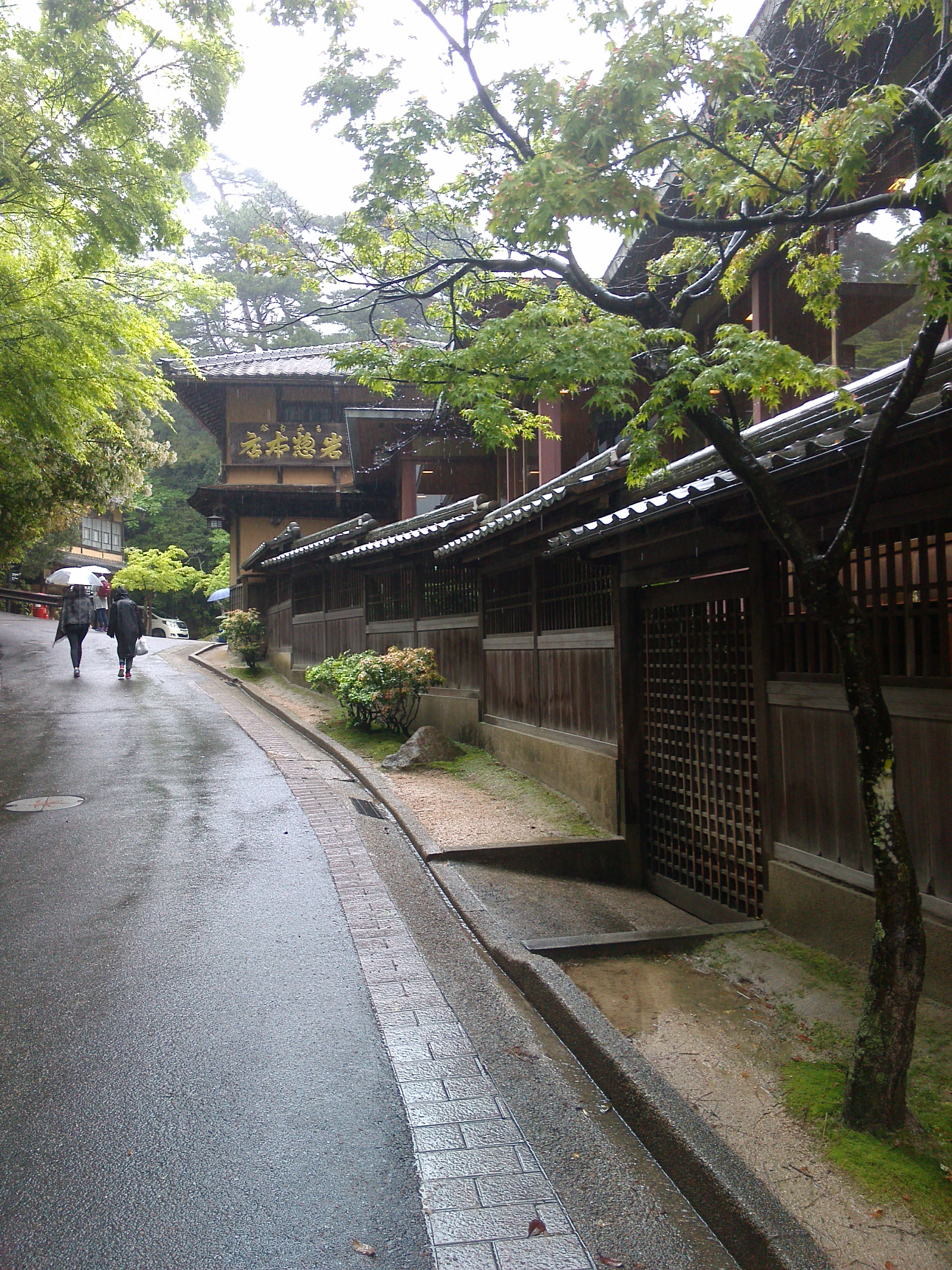 Deux étapes déjà parcourues en d'autres temps, mais qui restaient à découvrir pour d'autres. Kyoto nous promettant déjà quelques mondanités assez spécifiques question emploi du temps, il nous fallut donc enchaîner ces deux expéditions les 9 et 10 mai, tous deux jours de pluie du reste. Ma mémoire ne valant pas celle d'une geisha j'étais convaincue que ces deux points de chute étaient tous deux proches de Kyoto, occultant donc les 3h de trajet pour se rendre à Miyajima… Nara, en revanche, n'était pas bien difficile à atteindre en shinkansen, encore que le temple par lequel nous avions choisi de commencer nous sembla ne jamais se rapprocher. La pluie, le vent, et les daims lenahoschekivores eurent raison de notre patience et nous poussèrent vers une petite maison de thé sans le moindre regret, car même sans une divinité à nos côtés siroter un bol de matcha recèle également de trésors de spiritualité, l'ambiance étant toujours parfaite, travaillée sans en avoir l'air (cette pluie qui goutte sur les rochers dans la cour…!)