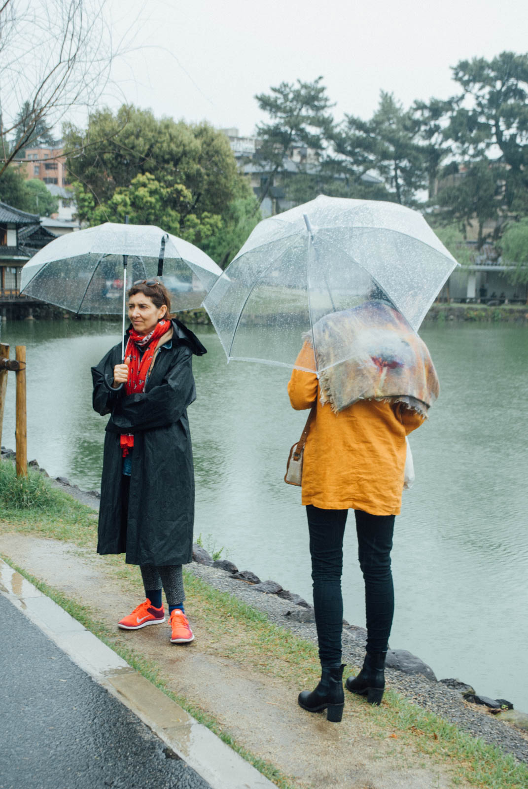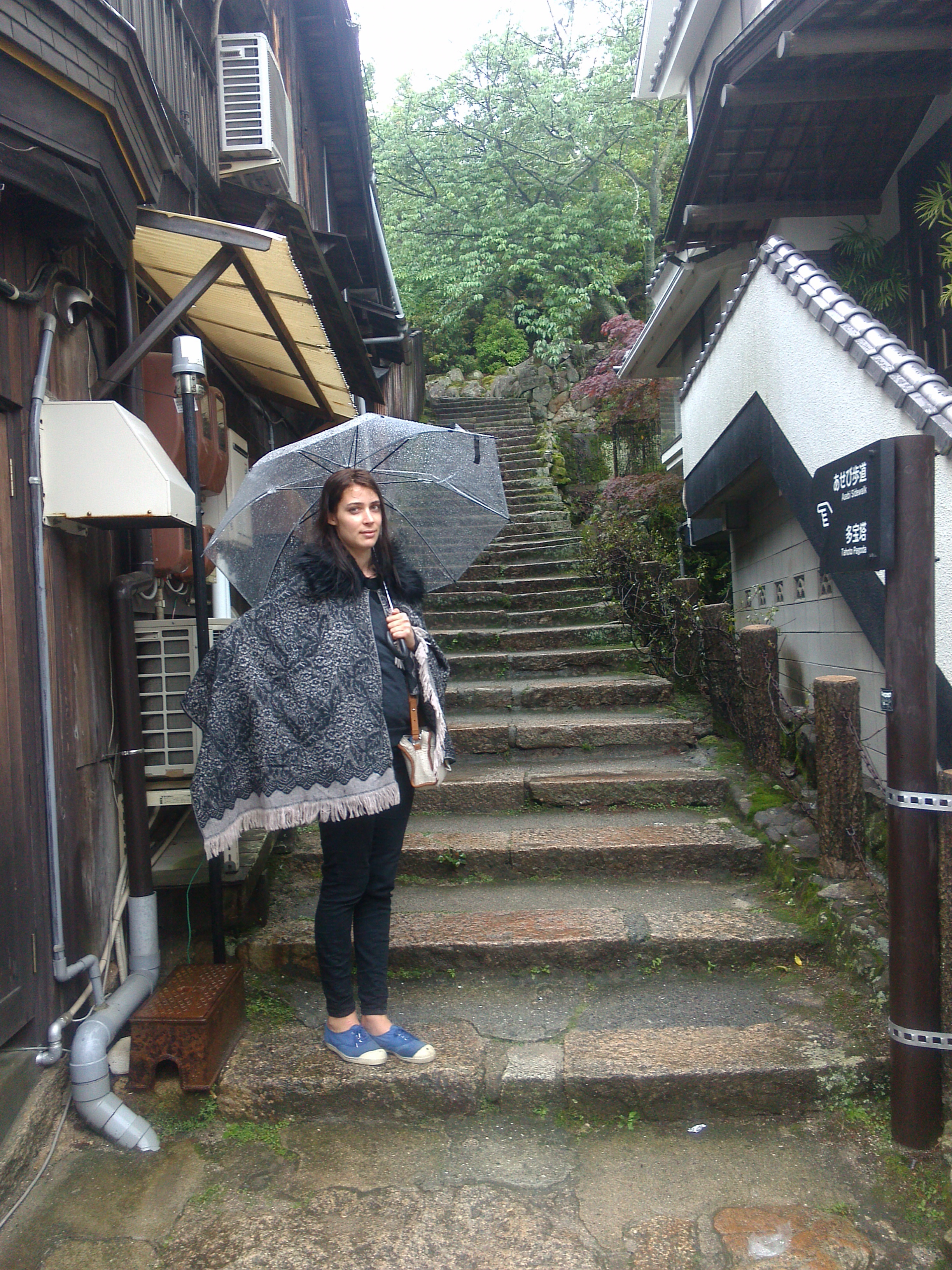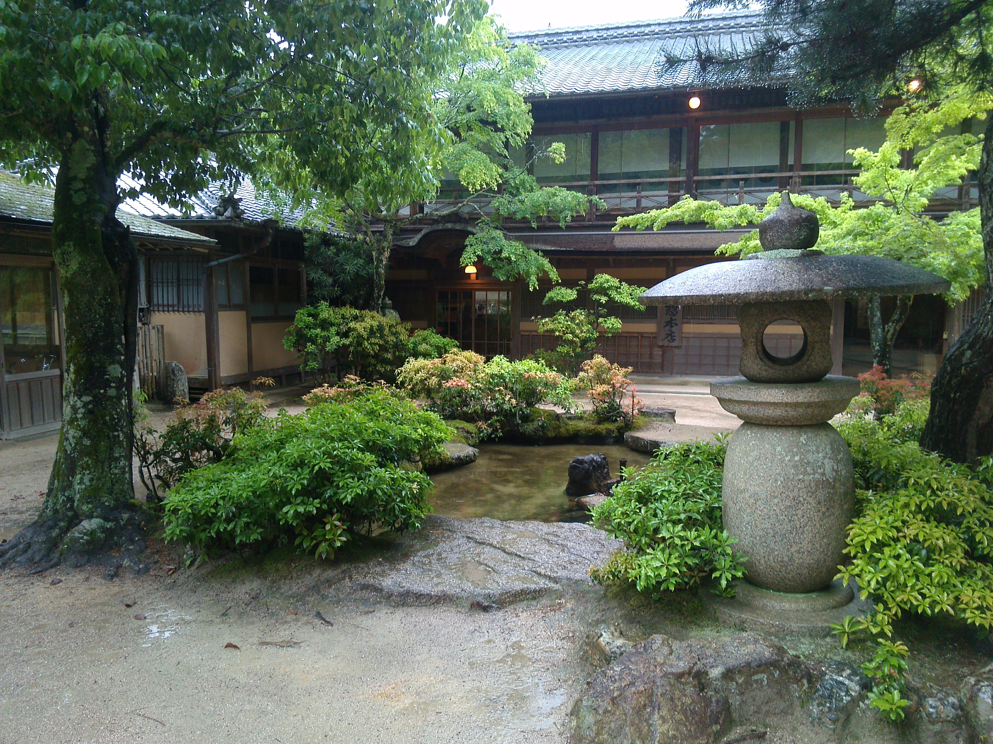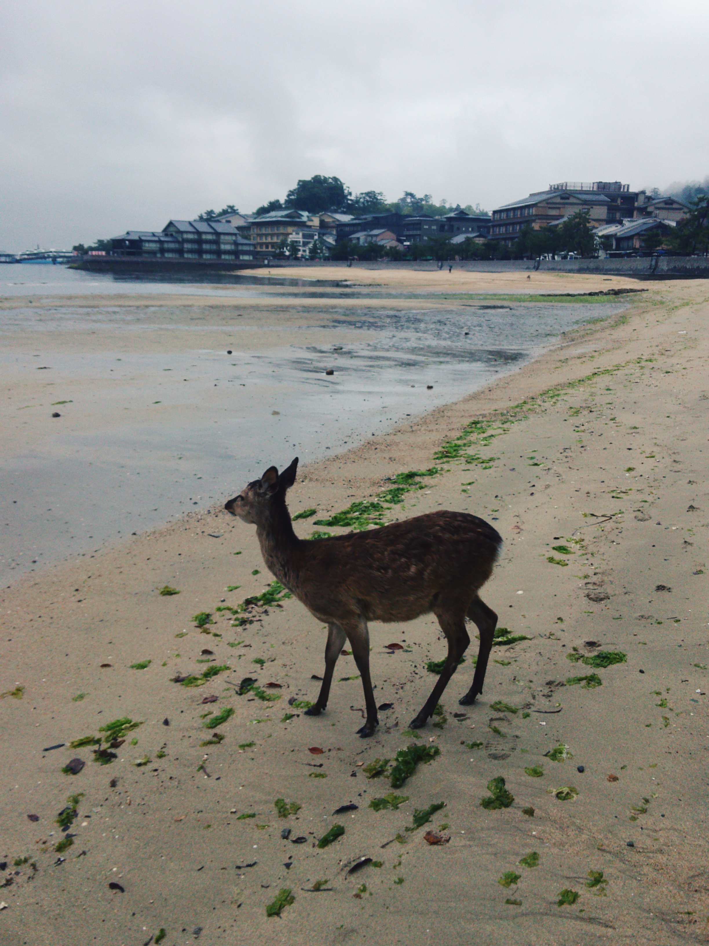 Deux étapes déjà parcourues en d'autres temps, mais qui restaient à découvrir pour d'autres. Kyoto nous promettant déjà quelques mondanités assez spécifiques question emploi du temps, il nous fallut donc enchaîner ces deux expéditions les 9 et 10 mai, tous deux jours de pluie du reste. Ma mémoire ne valant pas celle d'une geisha j'étais convaincue que ces deux points de chute étaient tous deux proches de Kyoto, occultant donc les 3h de trajet pour se rendre à Miyajima… Nara, en revanche, n'était pas bien difficile à atteindre en shinkansen, encore que le temple par lequel nous avions choisi de commencer nous sembla ne jamais se rapprocher. La pluie, le vent, et les daims lenahoschekivores eurent raison de notre patience et nous poussèrent vers une petite maison de thé sans le moindre regret, car même sans une divinité à nos côtés siroter un bol de matcha recèle également de trésors de spiritualité, l'ambiance étant toujours parfaite, travaillée sans en avoir l'air (cette pluie qui goutte sur les rochers dans la cour…!)
