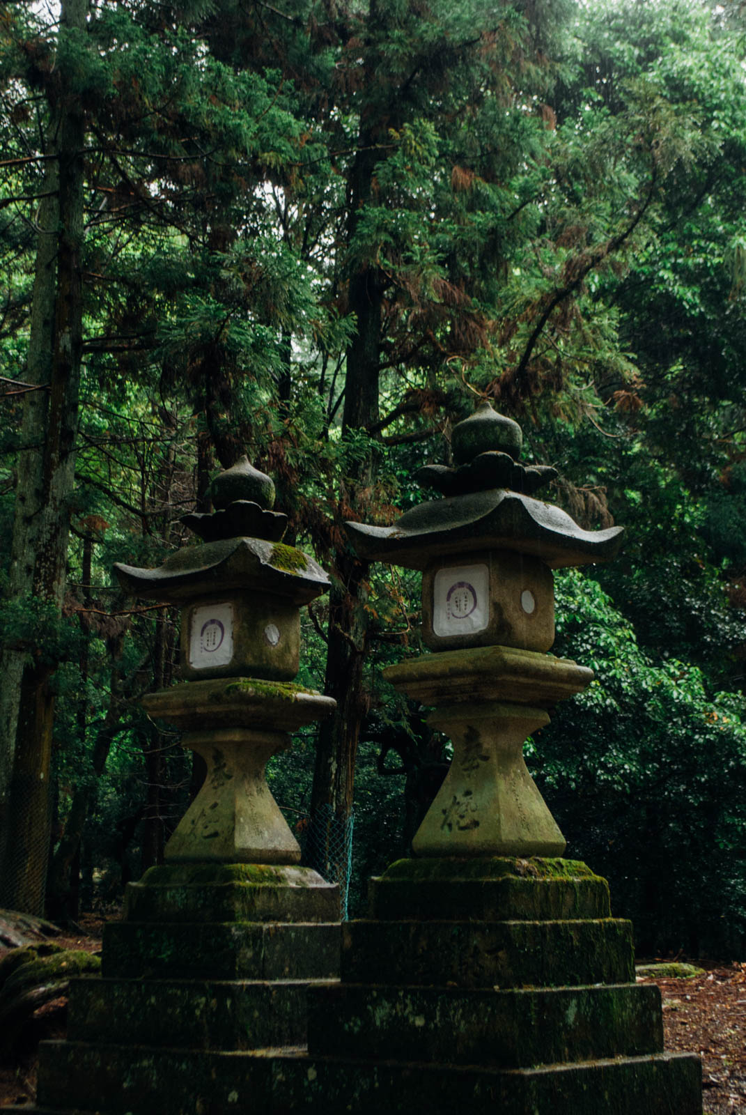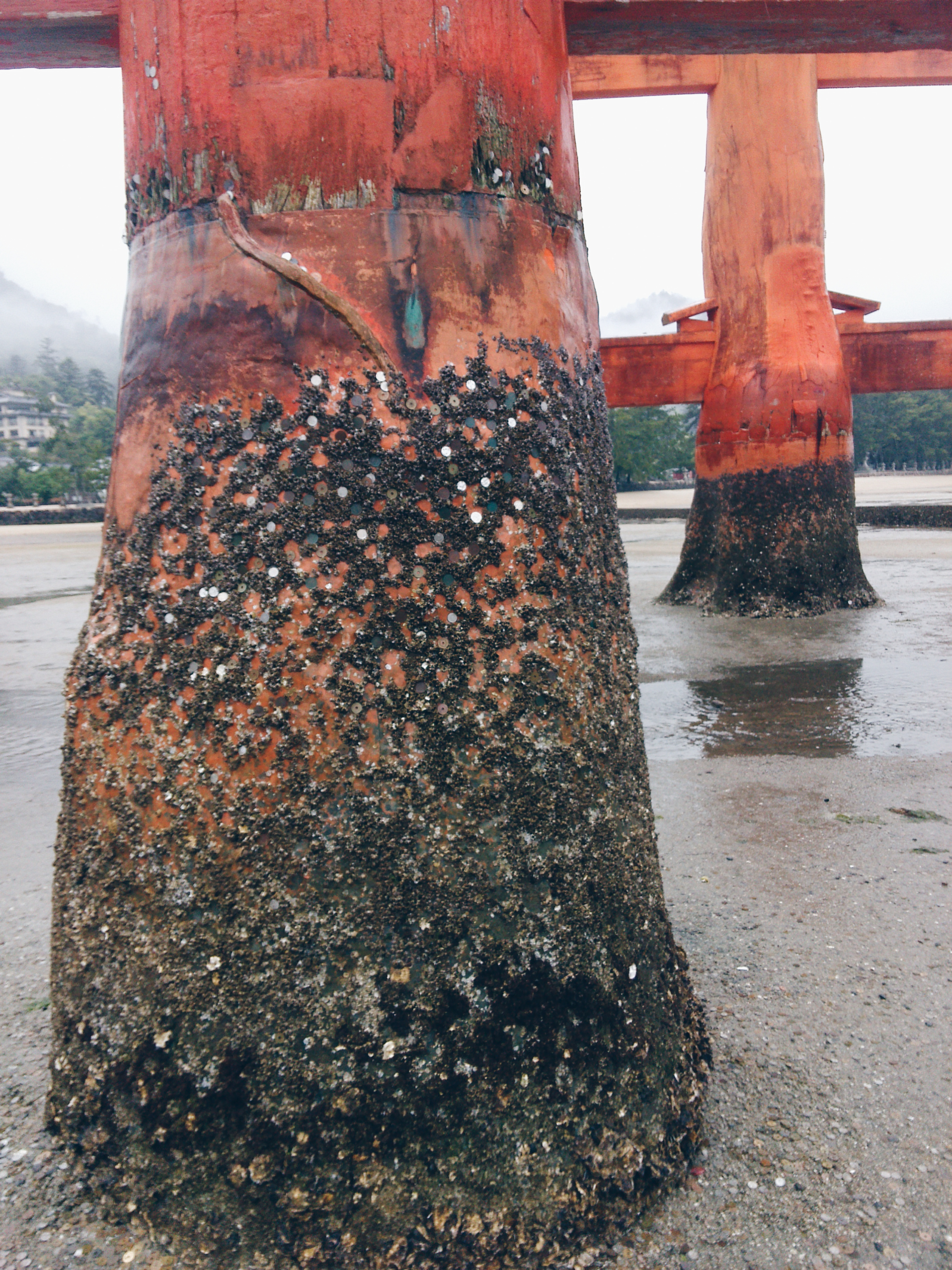Après un trajet très long comme statué précédemment, nous arrivons en ferry sur Miyajima toujours sous un temps pluvieux et humide qui n'en a que magnifié les paysages de l’île en les plongeant dans la brume. Quelques minutes après avoir débarqué, mon appareil photo me lâche à la première photo ou presque, alors même qu'à ce stade j'ai déjà le dos en compote de l'avoir trimballé les jours précédents, et une photo d'un shinkansen Evangelion pour solde de tout compte. J'ai donc pris les clichés qui suivent avec mon téléphone portable et l'application VSCO. Sur l'île, nous nous dirigeons vers la forêt primaire qui nous avait déjà tapé dans l'œil il y a 5 ans, non sans faire un saut dans l'une des nombreuses pâtisseries revendant la douceur locale à la forme de feuille d'érable.