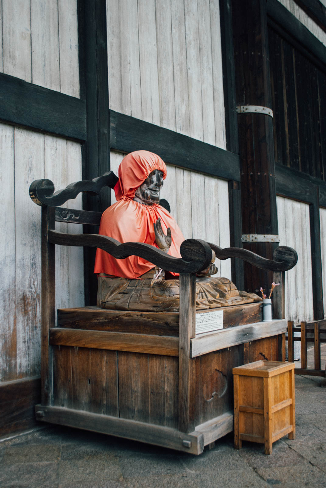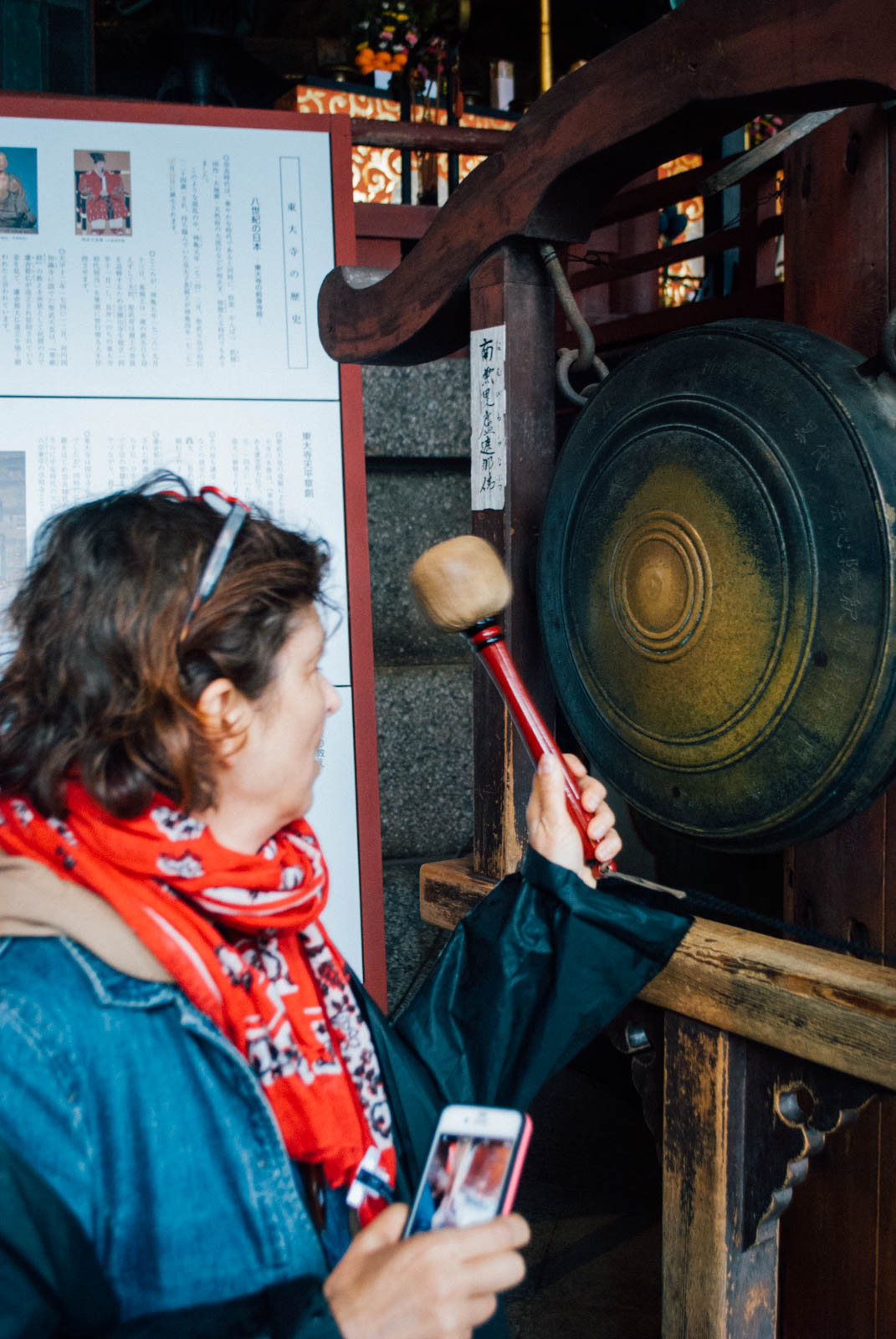Reparties de là requinquées, nous avons donc fait volte-face en direction du temple emblématique de la ville, le Tōdai-ji, non sans avoir usé de toute notre persuasion pour convaincre l'une d'entre nous de ne pas bouder Bouddha et de manière générale, les temples. Mais qui suis-je pour hiérarchiser ce qui a de l'intérêt au Japon, quand certains pans sont absents des guides touristiques ? Qui parle du plaisir à utiliser une demi-heure les fauteuils massants du Yodobashi Camera, au point de se mettre dans la mouise quand en sortant de là on s'aperçoit qu'avec la durée du trajet de bus qui nous attend, nulle gargotte ne sera encore ouverte pour nous sustenter ? Mais inversement, comment renoncer aux temples comme s'ils étaient surfaits, là où l'insolite aussi y est possible, tel ce petit handicapé moteur qui nullement rebuté par le défi faisait la queue pour ce poteau troué à travers lesquels se tortillaient difficilement les visiteurs ? Et enfin, quoi de plus mystique que de retrouver à l'exact même endroit, le même daim borgne 5 ans après ?