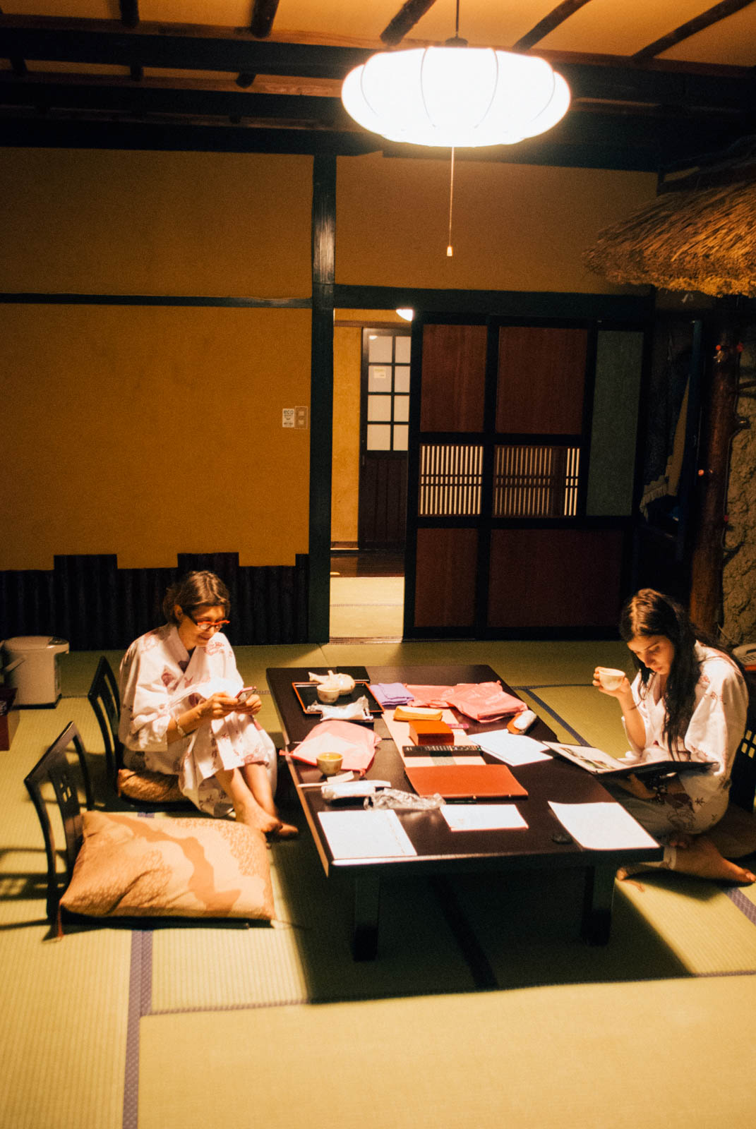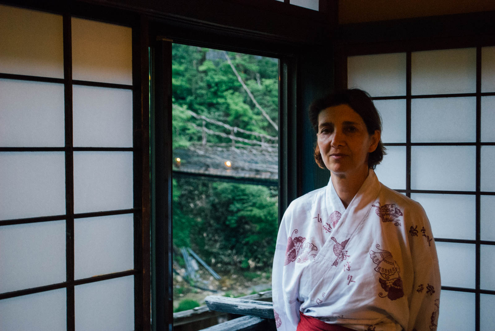 Suite à une recommandation de François, nous avions réservé une chambre dans un onsen de la région de Nikkō. Et conformément à sa description, ce n'était pas de la tarte de s'y rendre. Nous sommes même descendues par erreur dans la gare où les touristes changent pour aller à Nikkō ; il s'est avéré que pour notre part nous aurions dû rester dans le train, et encore ! Si un changement de wagon n'était pas nécessaire. Même arrivées au village l'onsen paraissait inaccessible : un quart d'heure en voiture (et un singe) le séparait de la gare — une gare incroyable, d'ailleurs, le quai étant creusé sous la montagne. Arrivées à l'onsen nous sommes tombées immédiatement sous le charme, entre le pont surplombant une rivière visiblement géothermale, le dîner de notre vie, la bande-son à peine audible du Voyage de Chihiro (vu dans la boutique, les mêmes tritons séchés que dans ce dessin-animé).
