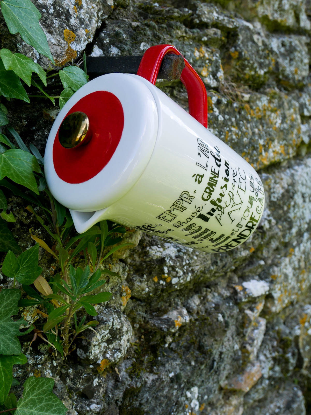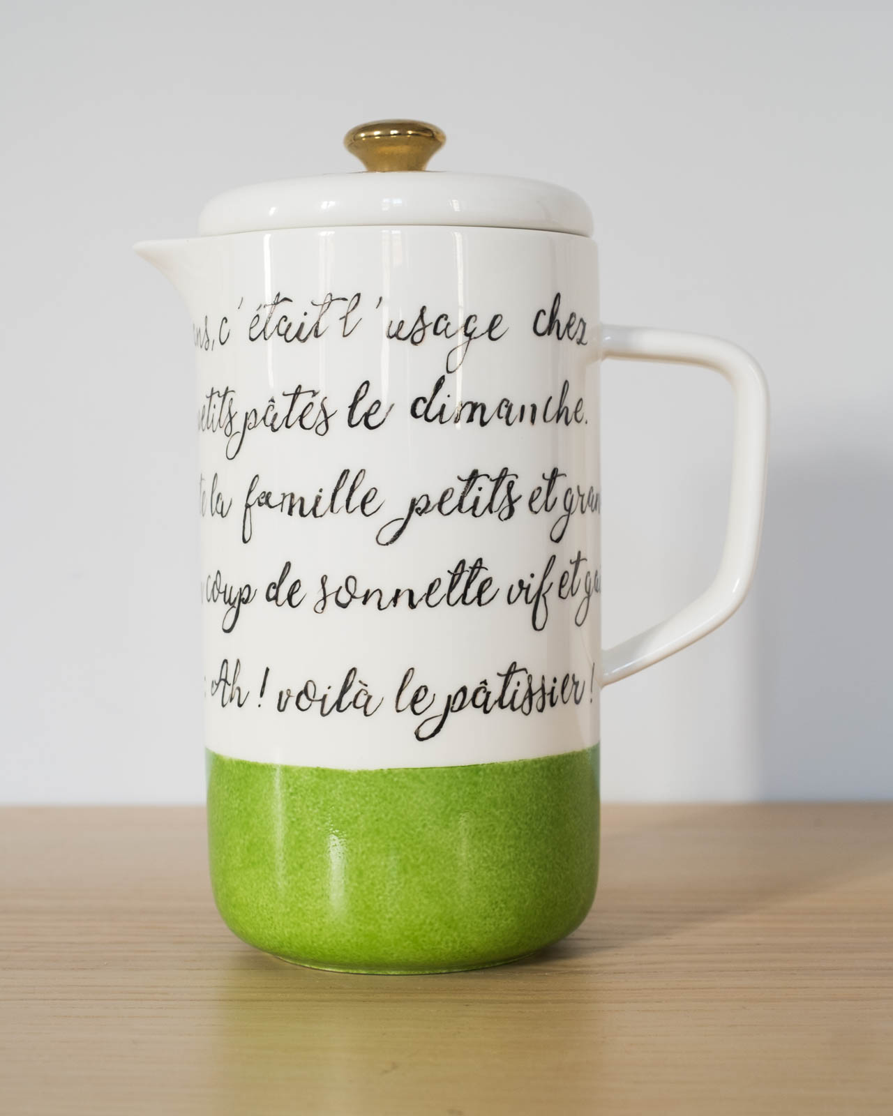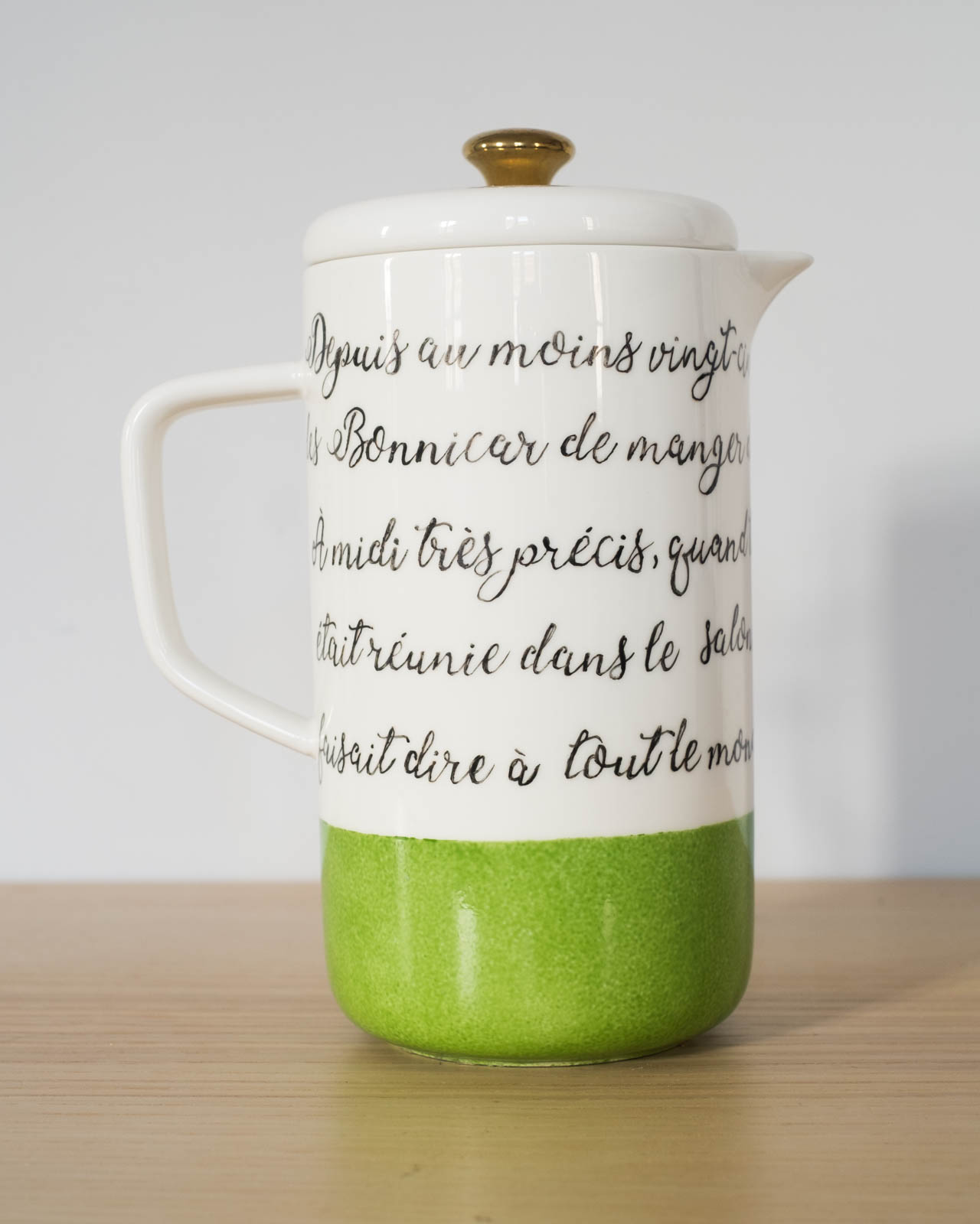 Cela fait donc des années que je vis, que ma famille vit, avec les pièces de ma mère disséminées partout dans notre quotidien, et dans le cercle familial étendu aussi. J'en retrouve dans la maison en Bretagne, certaines sont au Canada, bon sang, jusqu'à la douche de la maison où j'ai grandi est carrelée maison. Si des polices de caractère ont fait leur apparition depuis quelques années (de mieux en mieux sélectionnées), c'est souvent la ronde écriture de ma mère qui a transposé tant de bouquins sur bols, théières et j'en passe. Autrement, ou parfois en même temps, beaucoup de formes géométriques simples, de couleurs sans jamais tomber dans le criard. Si j'avais déjà il y a une dizaine d'années tenté de lui offrir un site du temps où ces choses étaient si simples et intuitives (sauf pour l'alignement vertical, ce qui n'a pas trop changé d'ailleurs, enflure), c'est lors d'un long passage chez elle en février — seulement 3h de bus nous séparent, désormais — que nous avons mis en place un site d'e-commerce.