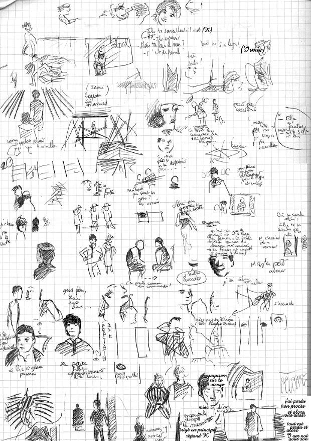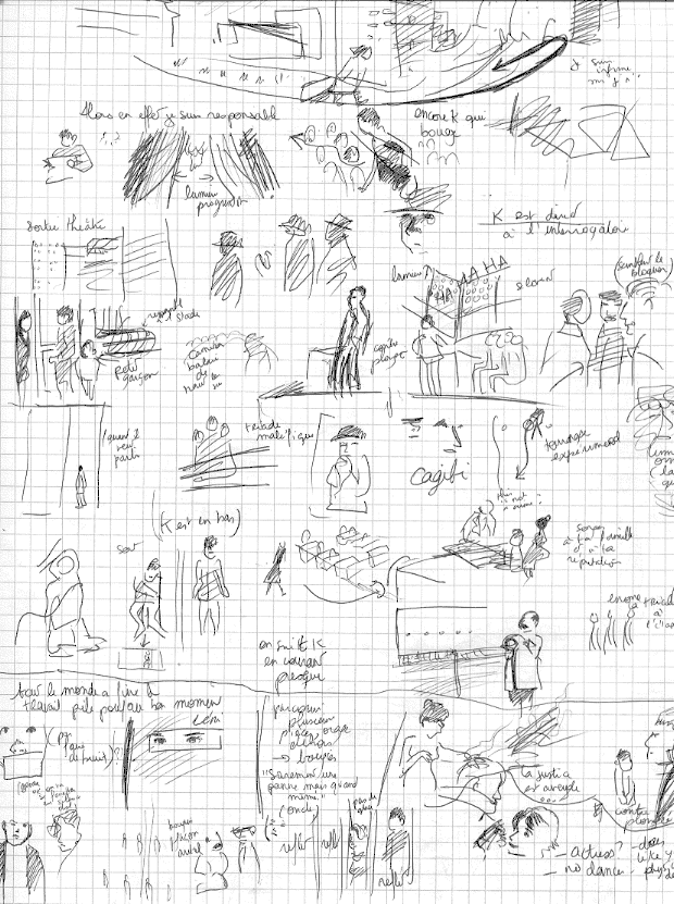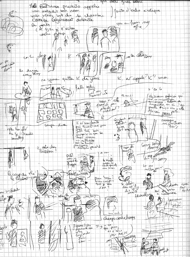 En cadal, story-board effectué en direct-live devant le film le Procès d'Orson Welles, sur un cahier tenu à l'envers et dans le sens contraire...