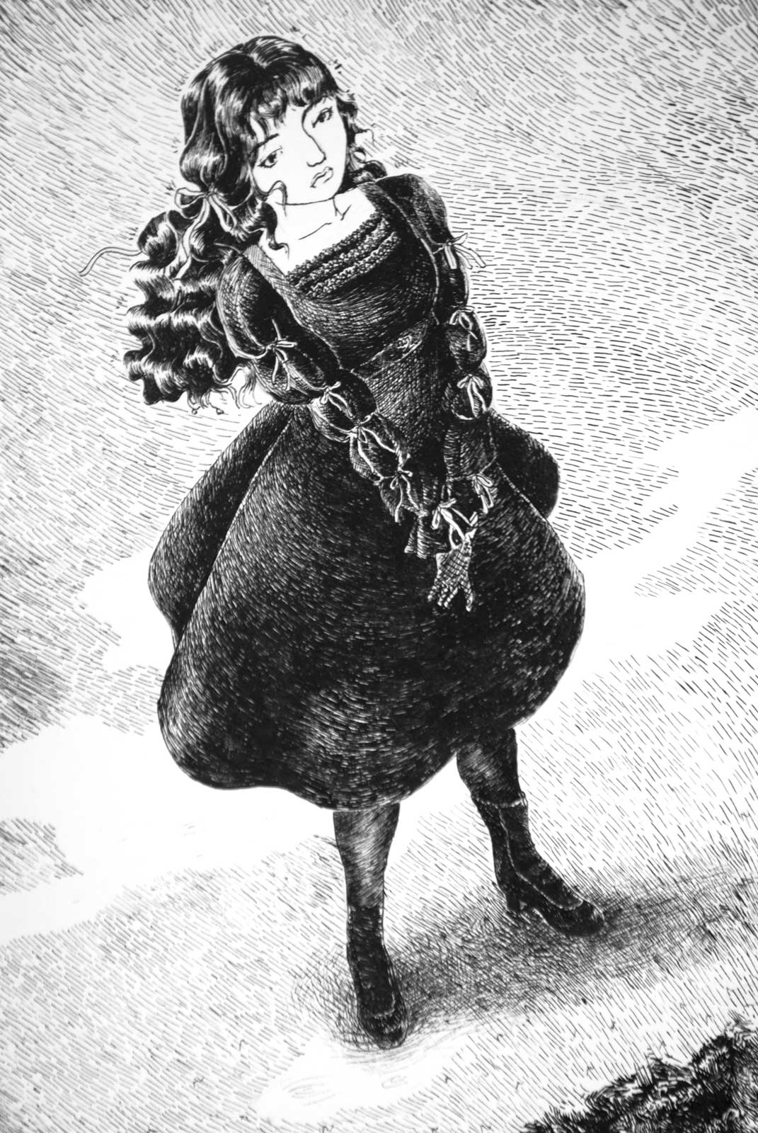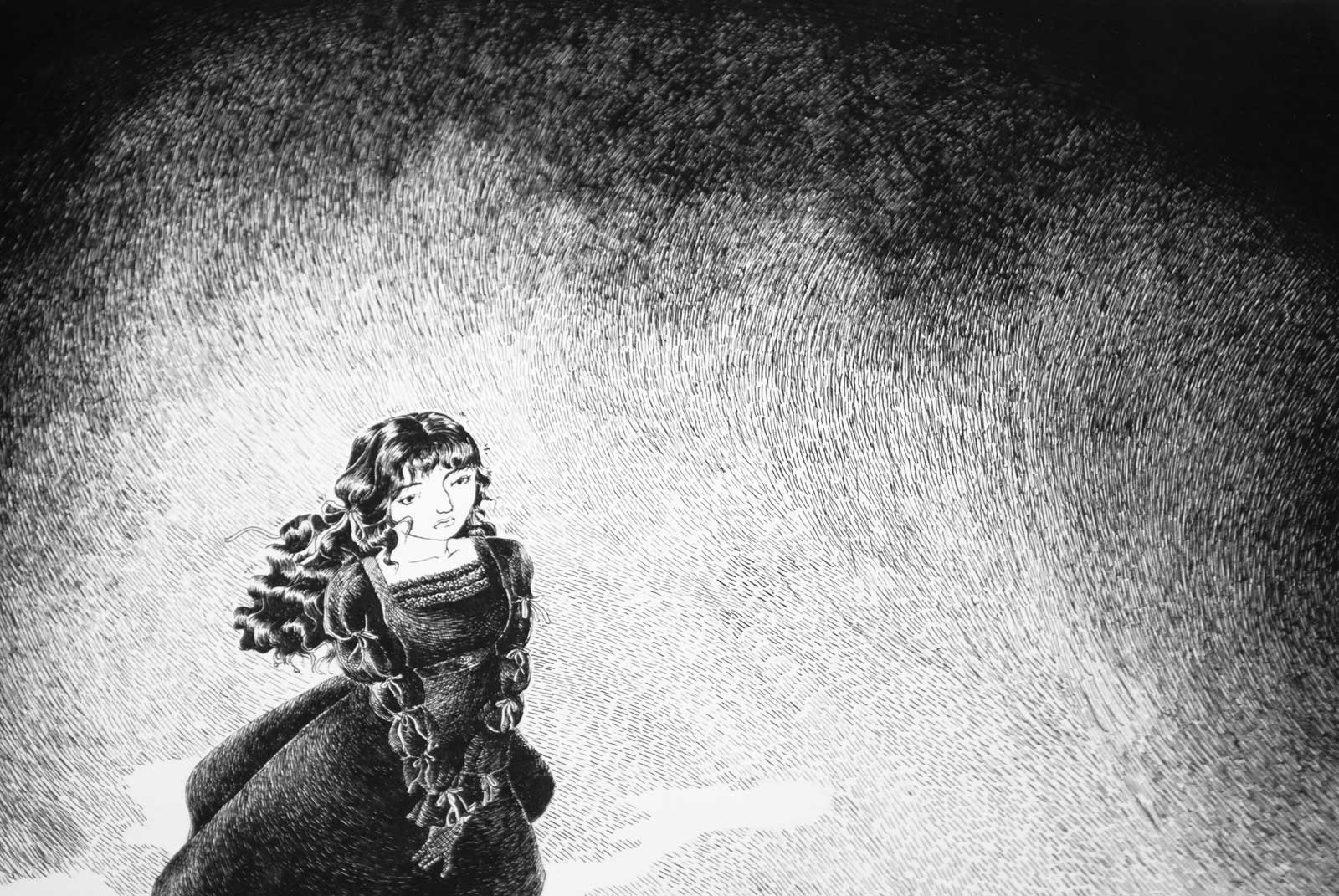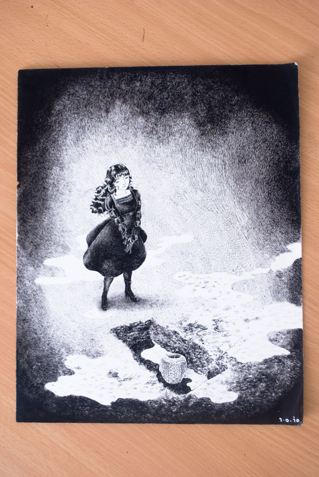 Petit interlude dessin, aujourd'hui j'ai fini deux illustrations ! Ça a un peu aidé que je sois seule tout le week-end et que j'ai donc pu continuer de bosser à l'atelier jusqu'à minuit hier sans coupure bouffe, et avec enthousiasme s'il vous plait. Bon la première de ces illusts ne nécessitait qu'une légère finition. Elle est loin d'être parfaite, il a fallu ré-apprivoiser la plume (et se souvenir de ce que ça fait quand une plume veut pas -> des patés-ronds de pluie). Avec les touches de blanco (inutiles) et la pliure en bas à droite, c'est pas mon meilleur original, mais tant pis, il faut ce qu'il faut pour se dérouiller !