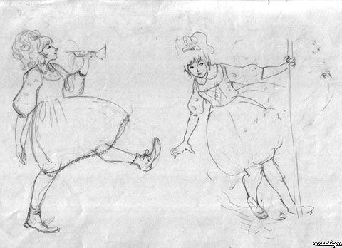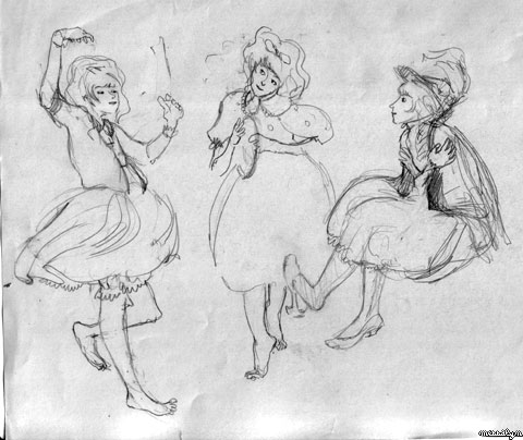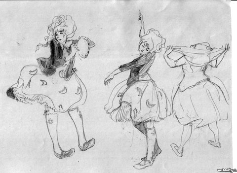 À propos de choses qui n'existent pas, inversement j'ai pu caler dans mon vilain rythme scolaire une retouche de ton illust, Célia (c'est d'ailleurs pour ça que j'ai attendu 5000 ans avant de répondre). J'aimais beaucoup le visage que j'avais peint mais il était clairement OC ! C'est que j'ai un peu loupé le moment où t'es passé de dessiner des anons à dessiner Melle Anatole et consœurs. Pour tout te dire, au début je lui avais fait une frange. Et le pire, c'est qu'en lisant Anatole sur ton dessin couleur, je l'ai pas pris au sérieux (c'est pas un nom de fille ROR). Ca m'a permis de rectifier le contresens sur sa silhouette aussi. Hahaha, juste quand je voulais payer honneur à l'art du tour de taille des 70's, j'lai dans le baba cool.