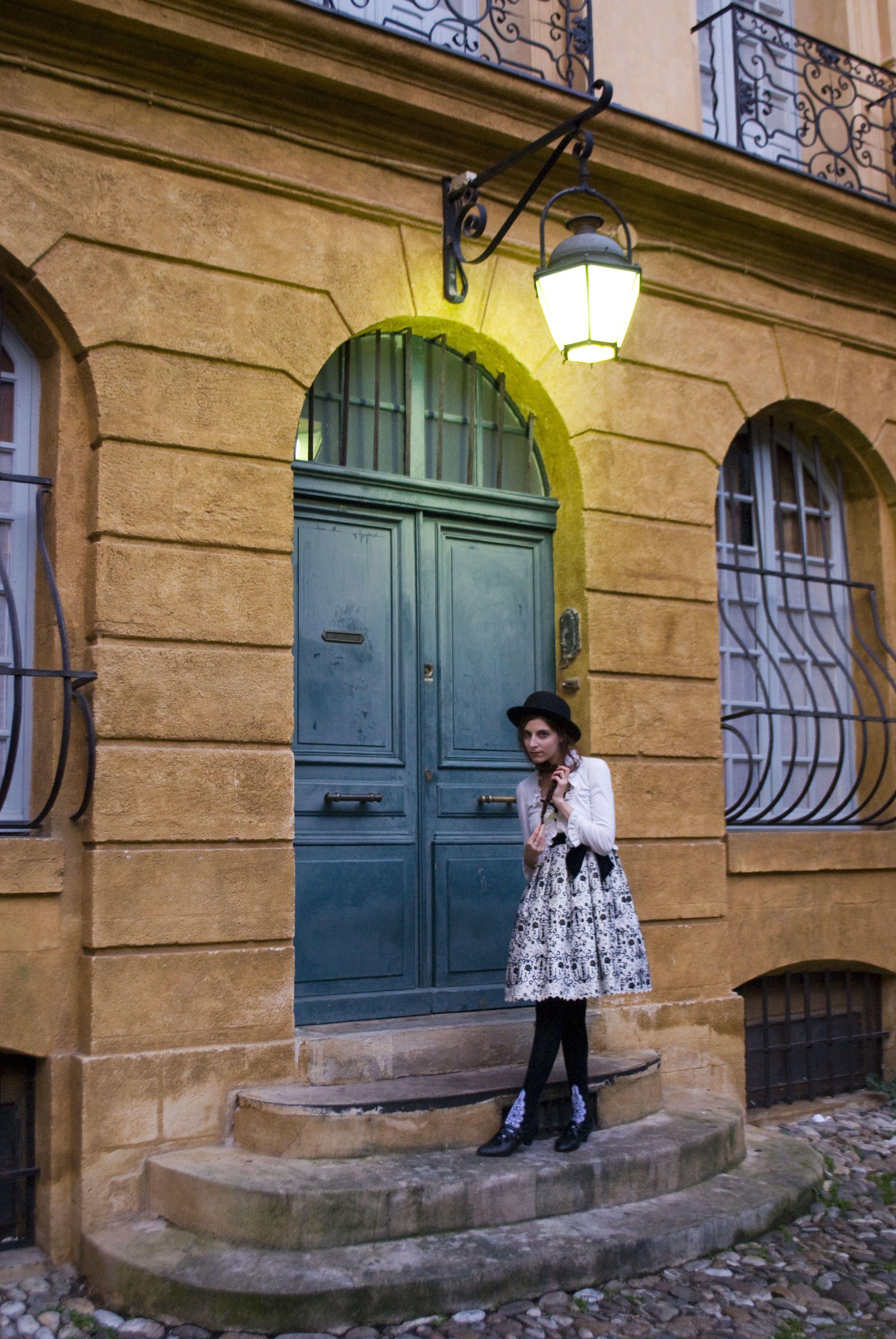 Bon, j'ai évidemment beaucoup digressé. Et tant que mon blog ne sera pas relooké avec une zone d'écriture plus large et une typo plus lisse et plus avenante, vous trouverez certainement que j'écris des tartines. Je ne suis pas terrible en compte-rendus, je crois. En sortant du salon de thé le temps s'était amélioré (« éclaircies » ne signifie pas la même chose à Paris et en Provence). J'avais emmené mon appareil photo car si j'imagine aisément des photos en solitaire dans la Nature, à deux la ville me fait moins peur. En plus, si j'avais un reproche à faire à Nella, ça serait (un comble pour un modèle) de ne justement pas assez se montrer en lolita ! (hormis quelques défilés). Je comprends, aussi. Dans le Lolita aussi, il y a des poseuses, des opportunistes, etc… il y a de quoi se poser des questions sur ses démarches. Mais j'ai toujours eu ce sentiment que le Lolita n'incitait pas qu'à la consommation, mais aussi à la contribution. Y compris, la simple contribution visuelle. Moi, j'aime voir ce qui se fait dans ce milieu. J'aime voir le goût des gens pour la composition de tenue, j'aime quand ils me montrent des lieux qui mettent en valeur ces vêtements, et j'aime les lire… Aix, à la nature si sèche, a heureusement un centre-ville très mignon avec ses petits pavés, ses lampadaires, et la lumière du Sud (quand je pense à tout ce gâchis de forêts, en région parisienne). Oui, cette ville manque de luxuriants jardins publics (sauf le Pavillon Vendôme) et de serres (c'est beau les serres), mais pour le reste, si on arrive à esquiver le flot continuel de touristes, il y a moyen de se tirer de jolis portraits ! En plus, Nella est si photogénique ! La dernière fois que je me suis prise en photo, j'ai du faire +140 prises pour avoir quelques jolis profils… C'est pourquoi je vais spammer ma sélection de photos, vu que par habitude du manque de choix je garde toutes les bonnes ^o^;