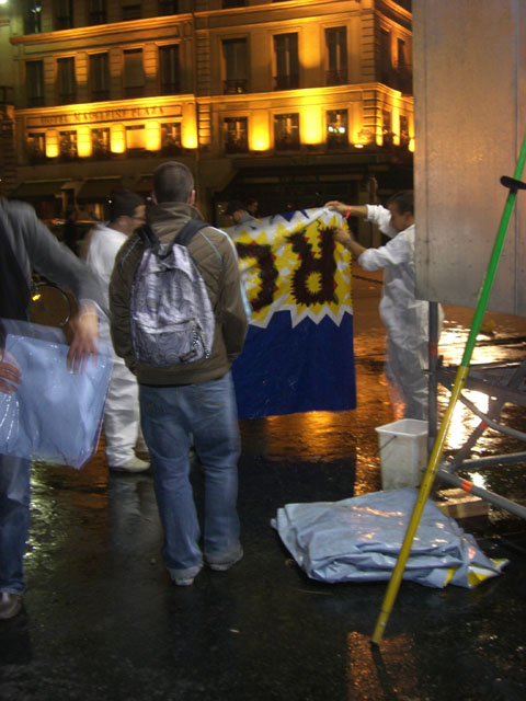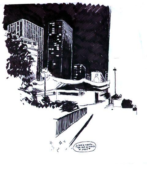 Il y a pile-poil une semaine, c'était la Nuit Blanche, sommée par un ou deux de mes profs de la faire, je suis donc restée à Paris, et je l'ai faite (pas qu'une fois dans la semaine d'ailleurs mais c'est une autre histoire). L'évènement en lui-même... bon disons que j'avais toujours eu envie de faire des croquis la nuit (*) et que l'occasion s'y prêtait. Quant à un relevé photographique... qu'il tende plutôt vers l'abstraction alors. Voici des morceaux choisis :